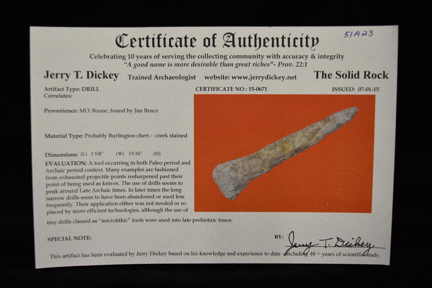 3 5/8" Drill, Creek Stained, Dickey COA, Boone Co, Missouri