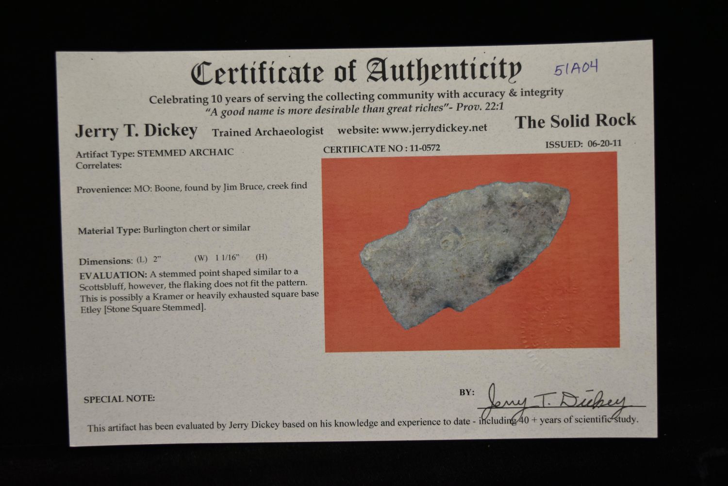 2" Stemmed Archaic Point, Dickey COA, Boone Co, Missouri