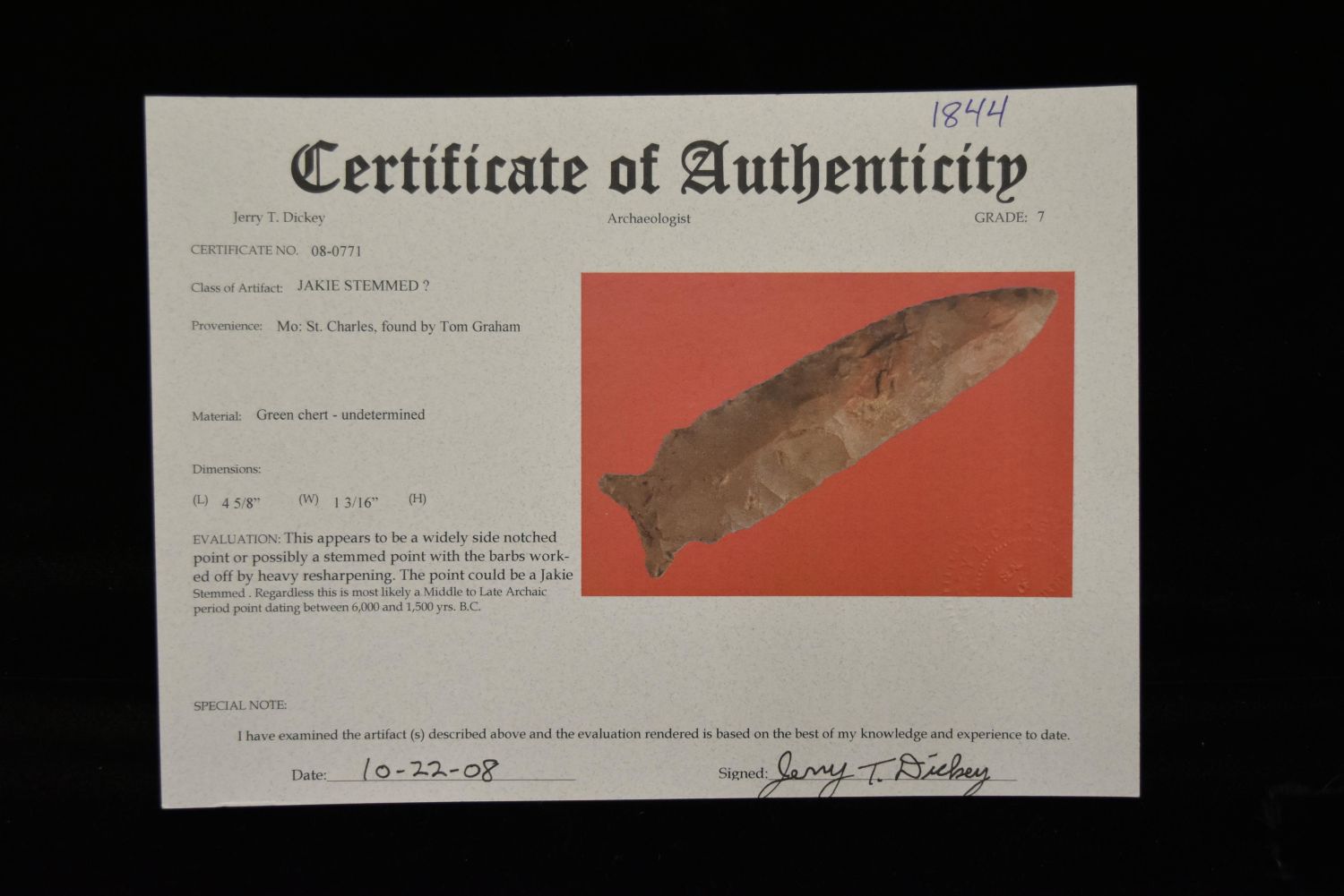 4 5/8" Jakie Stemmed Point, Dickey COA, St Charles Co, Missouri