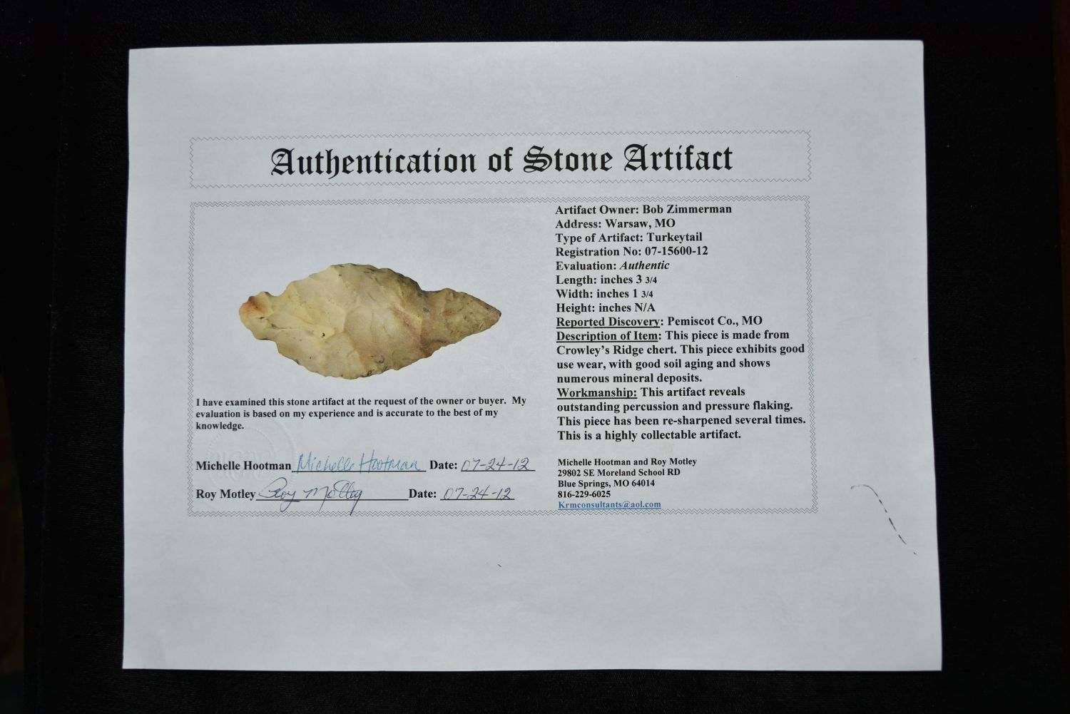 3 3/4" Turkey Tail Point, Motley COA, Pemiscott Co, Missouri