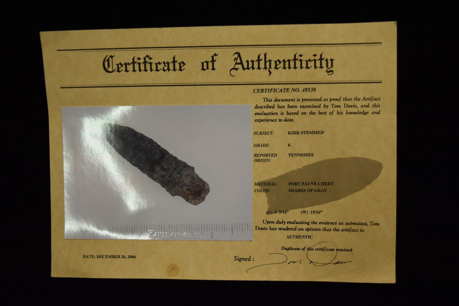 3 3/16" Kirk Stemmed Point, Davis COA, Tennessee