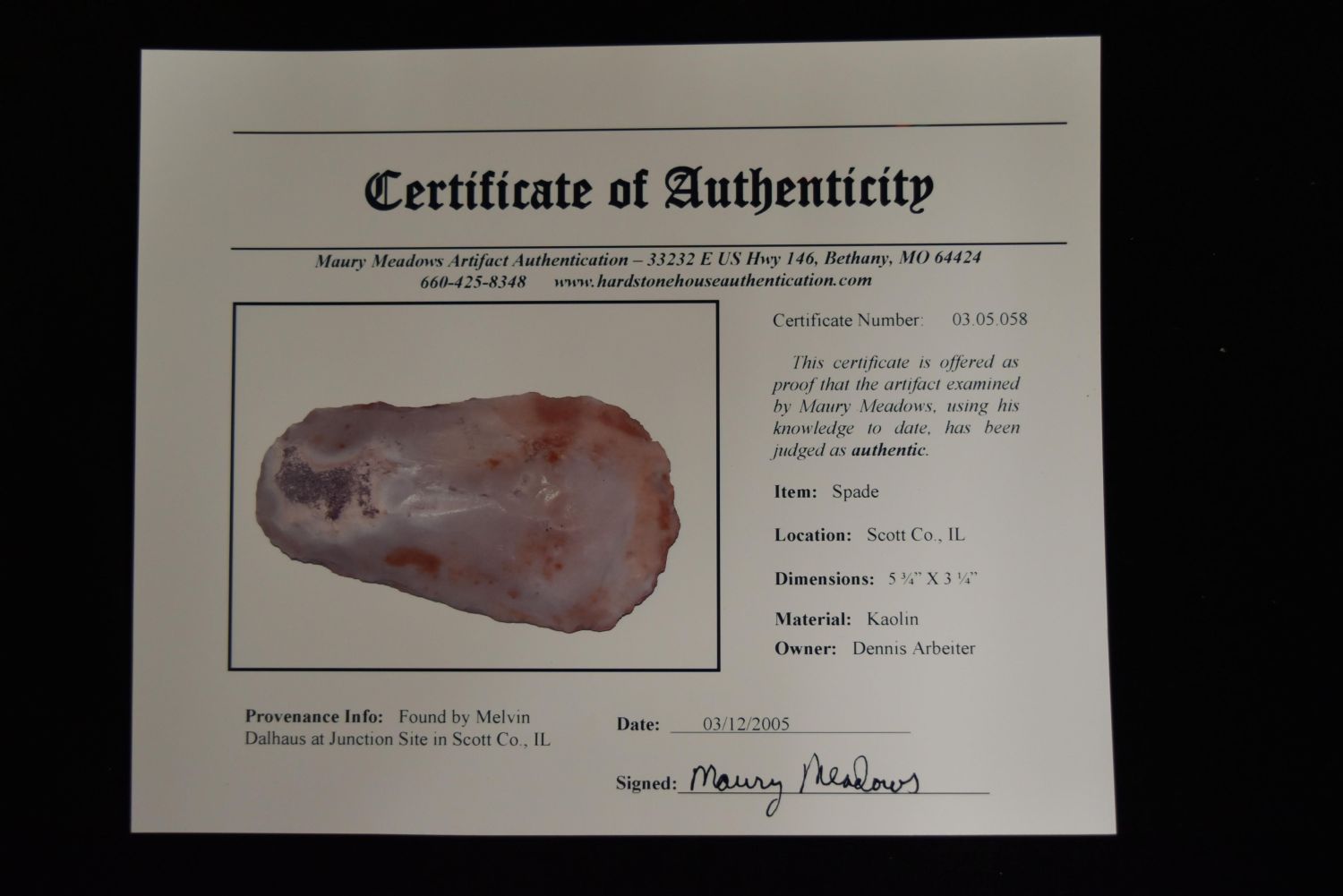 5 3/4" Kaolin Spade, Meadows COA, Scott Co, Illinois