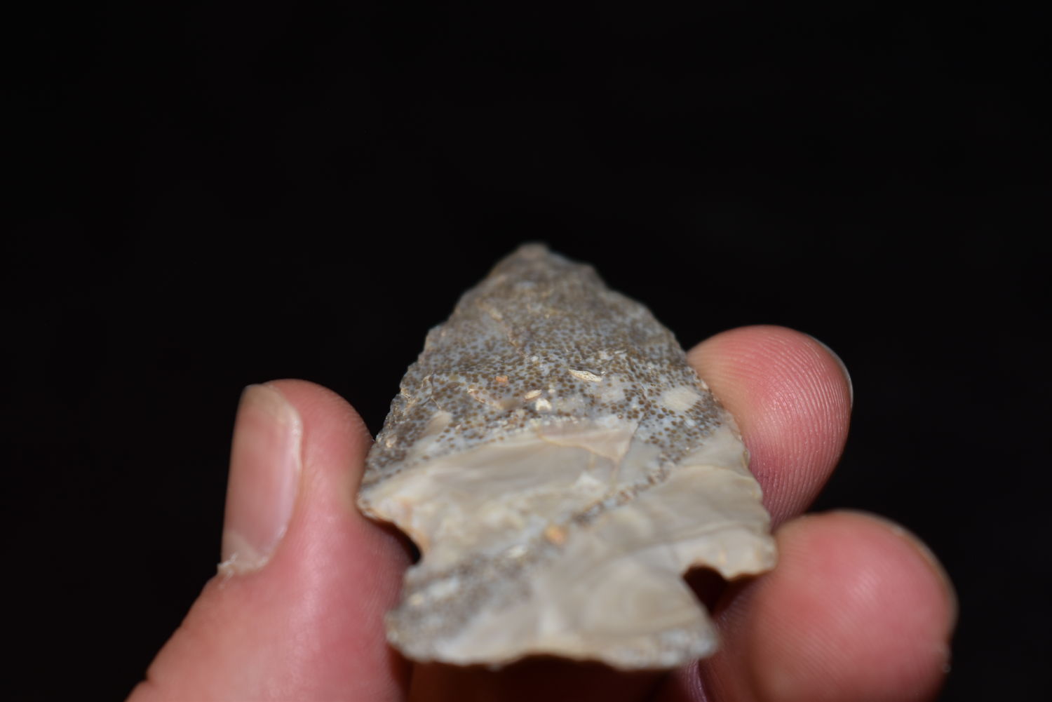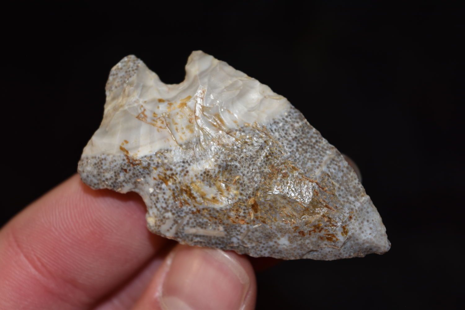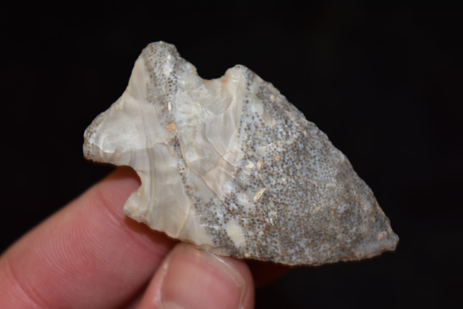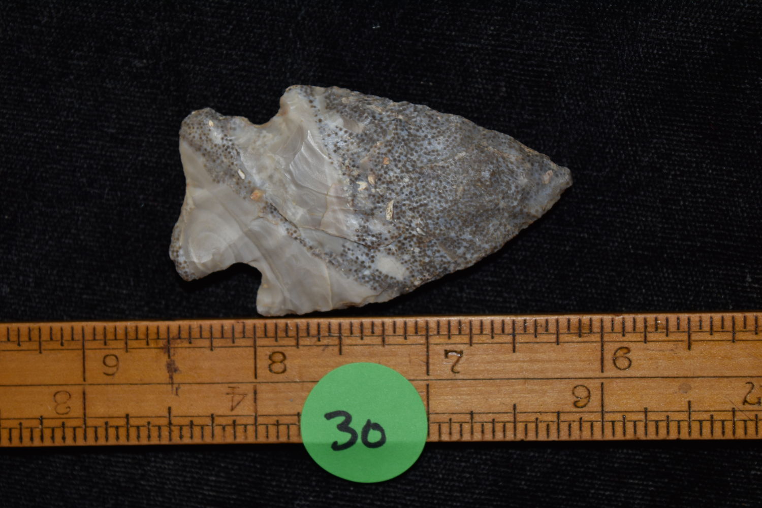 2 1/4″ Rice Lobed Point, Excellent Material with Fossil Inclusions, FB Herb Sanders, Douglas Co, Missouri, Native American Arrowhead, Artifact