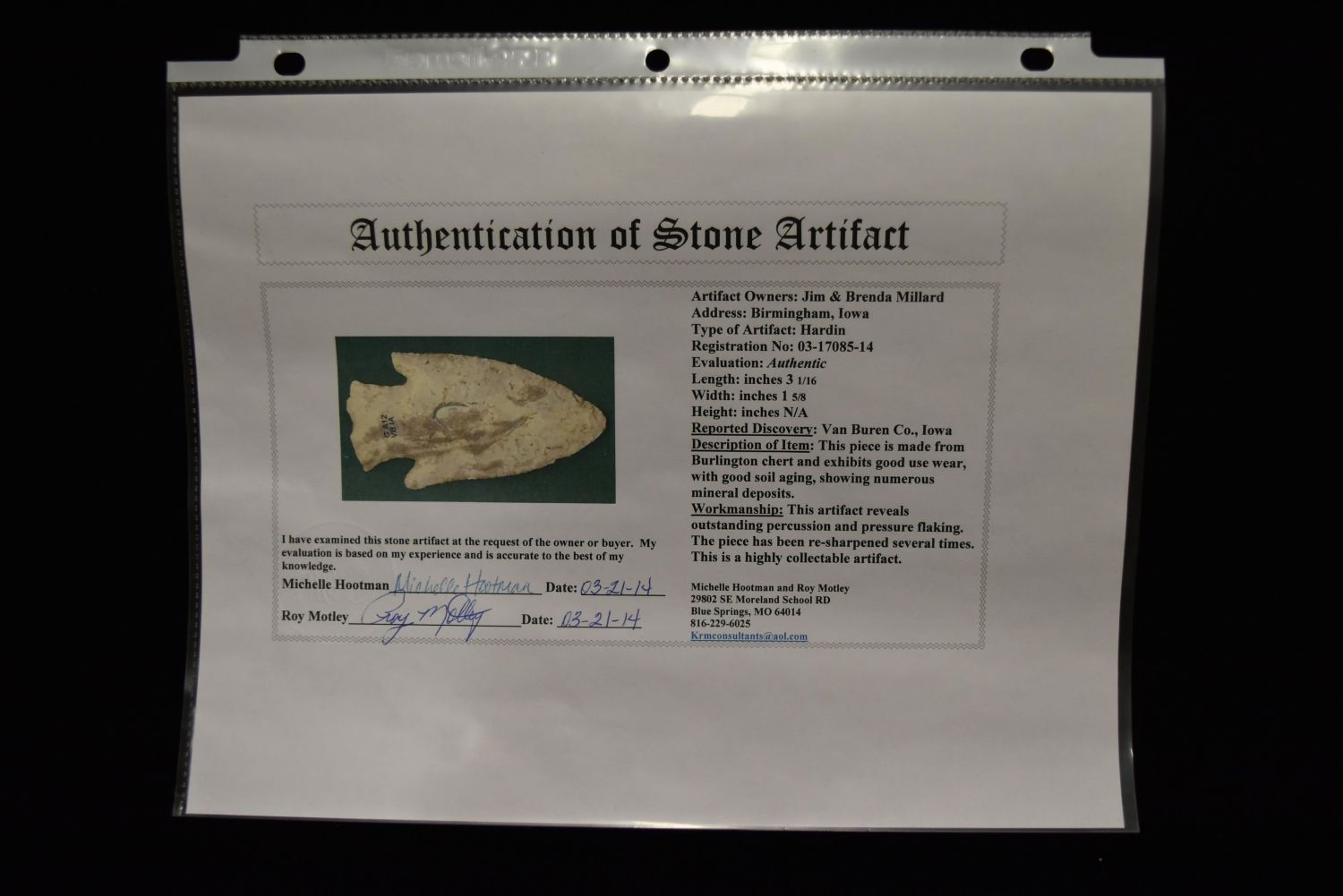 3 1/16" Hardin Point, Motley COA, Van Buren Co, Iowa, Ex Jim Millard, Native American Arrowhead, Indian Artifact