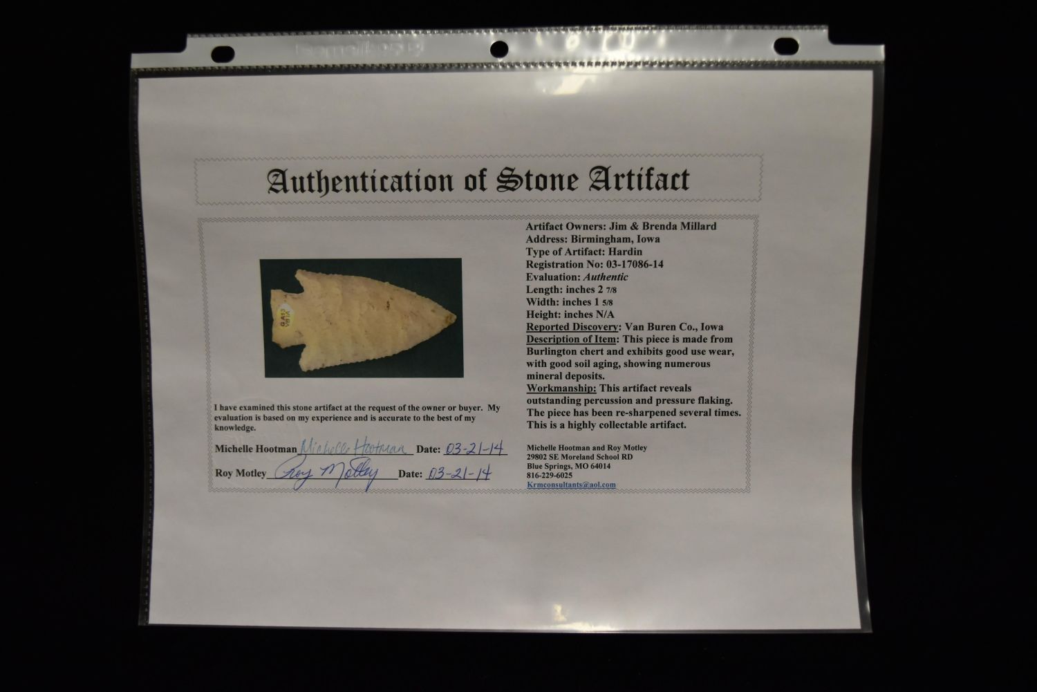 2 7/8" Hardin Point, Motley COA, Van Buren Co, Iowa, Ex Jim Millard, Native American Arrowhead, Indian Artifact