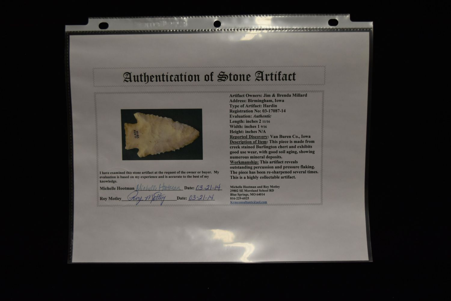 2 11/16" Hardin Point with Serrations, Motley COA, Van Buren Co, Iowa, Ex Jim MIllard, Native American Arrowhead, Indian Artifact
