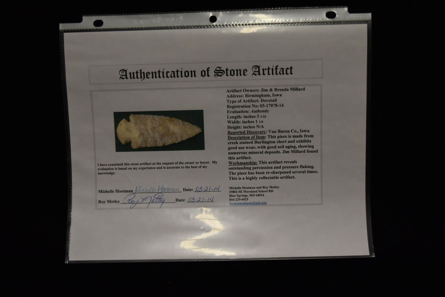 3 1/16" Dovetail Point, Motley COA, Van Buren Co, Iowa, Found by Jim Millard, Native American Arrowhead, Indian Artifact