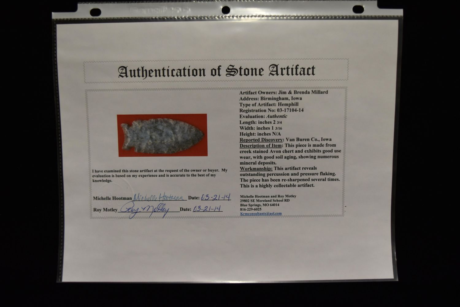 2 3/4" Hemphill Point, Motley COA, Van Buren Co, Iowa, Great Base Shape and Form, Native American Arrowhead, Indian Artifact
