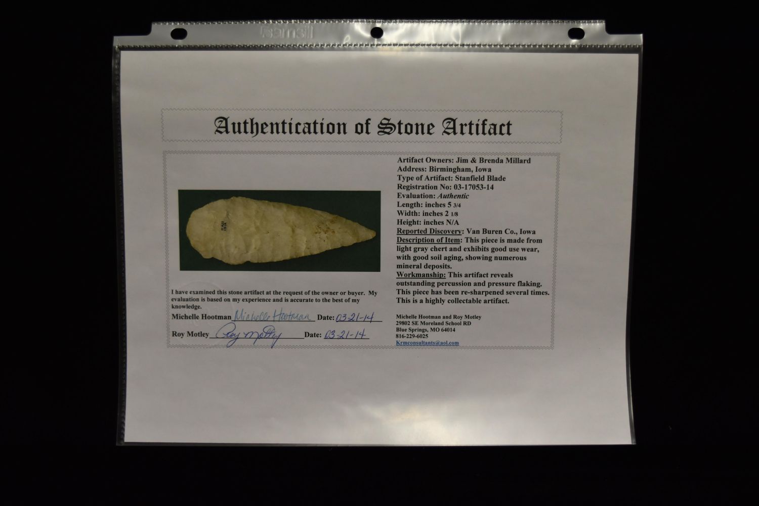 5 3/4" Stanfield Blade, Motley COA, Van Buren Co, Iowa, Nice Flaking, Ex Jim Millard, Native American Arrowhead, Indian Artifact