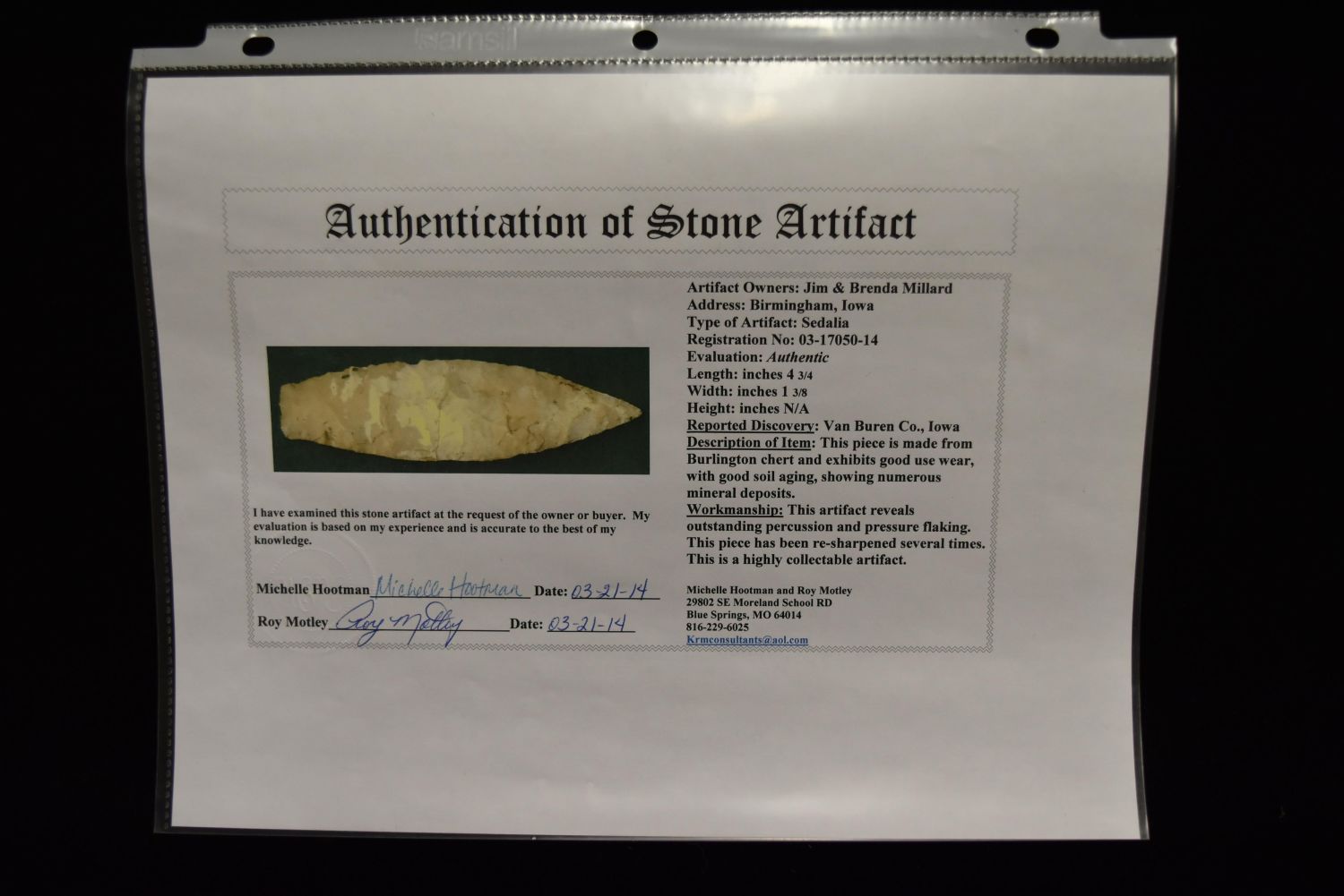 4 3/4" Sedalia Point, Motley COA, Van Buren Co, Iowa, Great Color and Definition, Ex Jim Millard , Native American Arrowhead, Indian Artifact