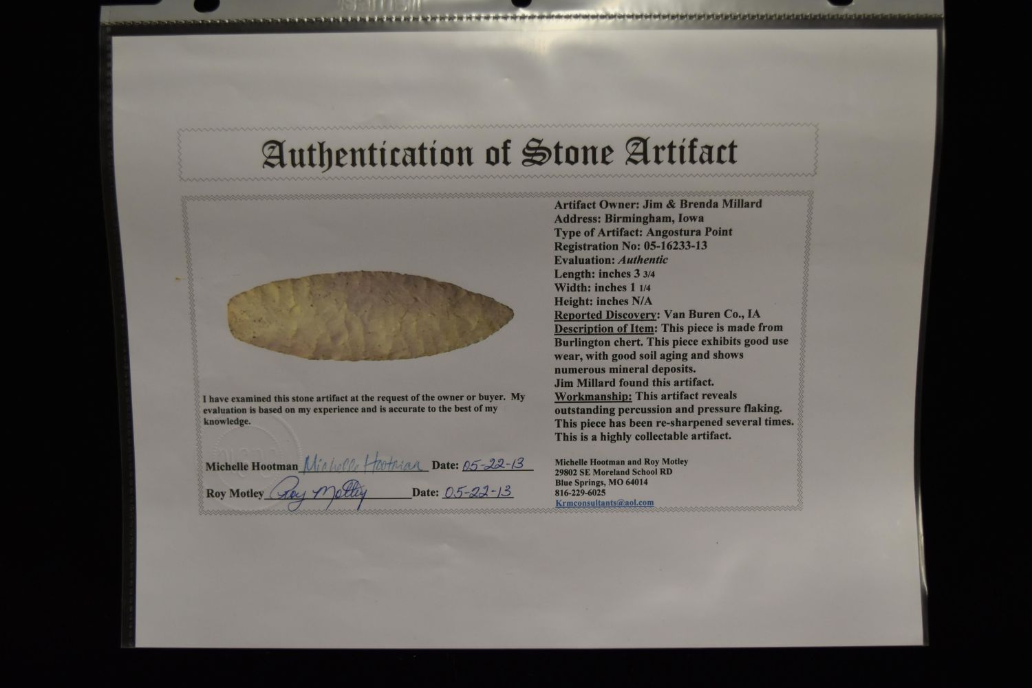 3 3/4" Angostura Point, Motley COA, Van Buren Co, Iowa, Great Flaking, Ex Jim Millard, Native American Arrowhead, Indian Artifact