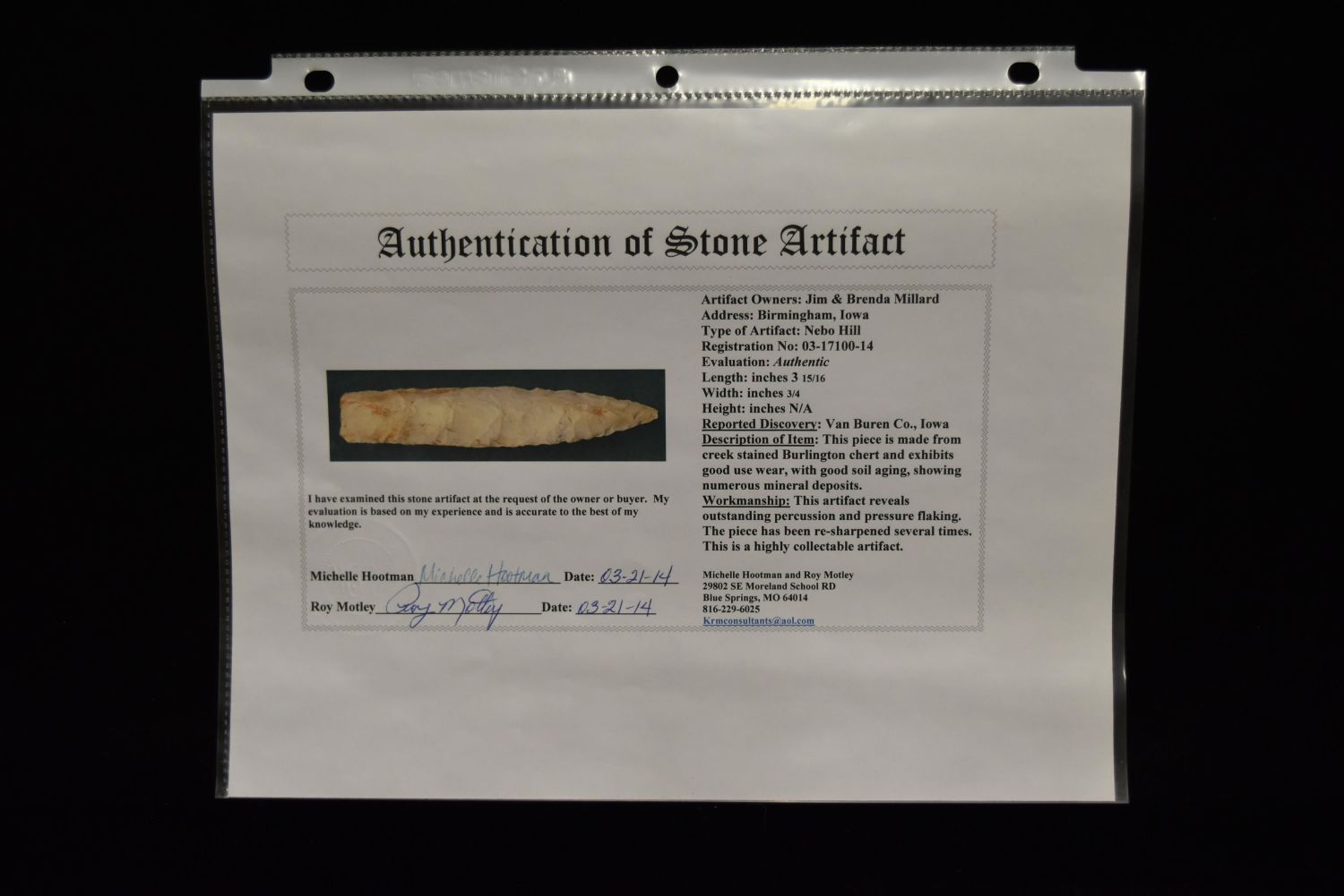 3 15/16" Nebo Hill Point, Motley COA, Van Buren Co, Iowa, Ex Jim Millard, Native American Arrowhead, Indian Artifact