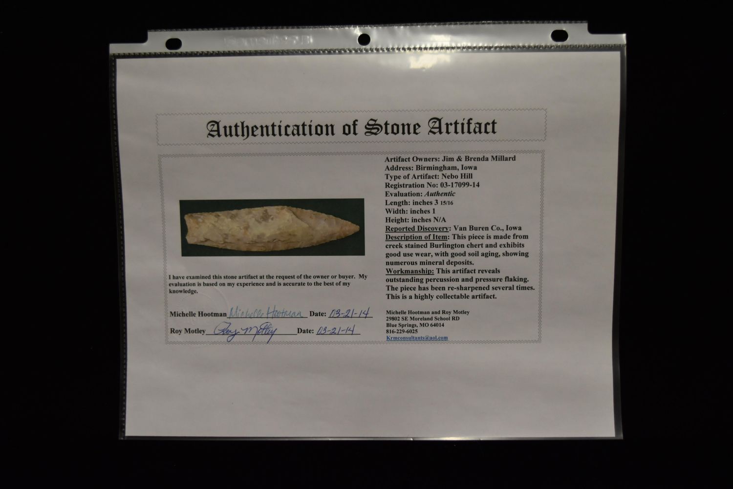 3 15/16" Nebo Hill Point, Motley COA, Van Buren Co, Iowa, Nice Shape, Ex Jim Millard , Native American Arrowhead, Indian Artifact