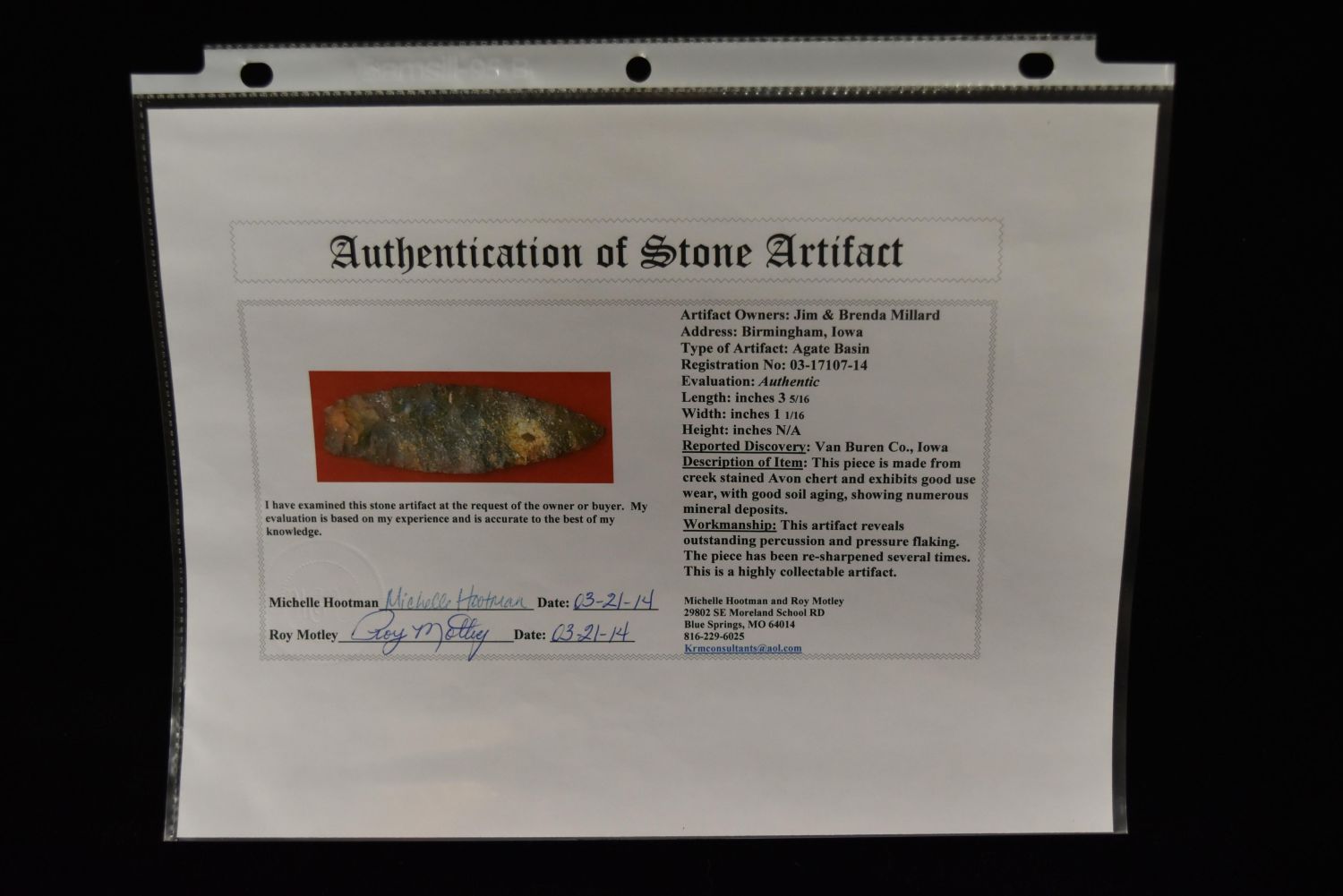3 5/16" Agate Basin Point, Motley COA, Van Buren Co, Iowa, Amazing Color and Form, Ex Jim Millard, Native American Arrowhead, Indian Artifact