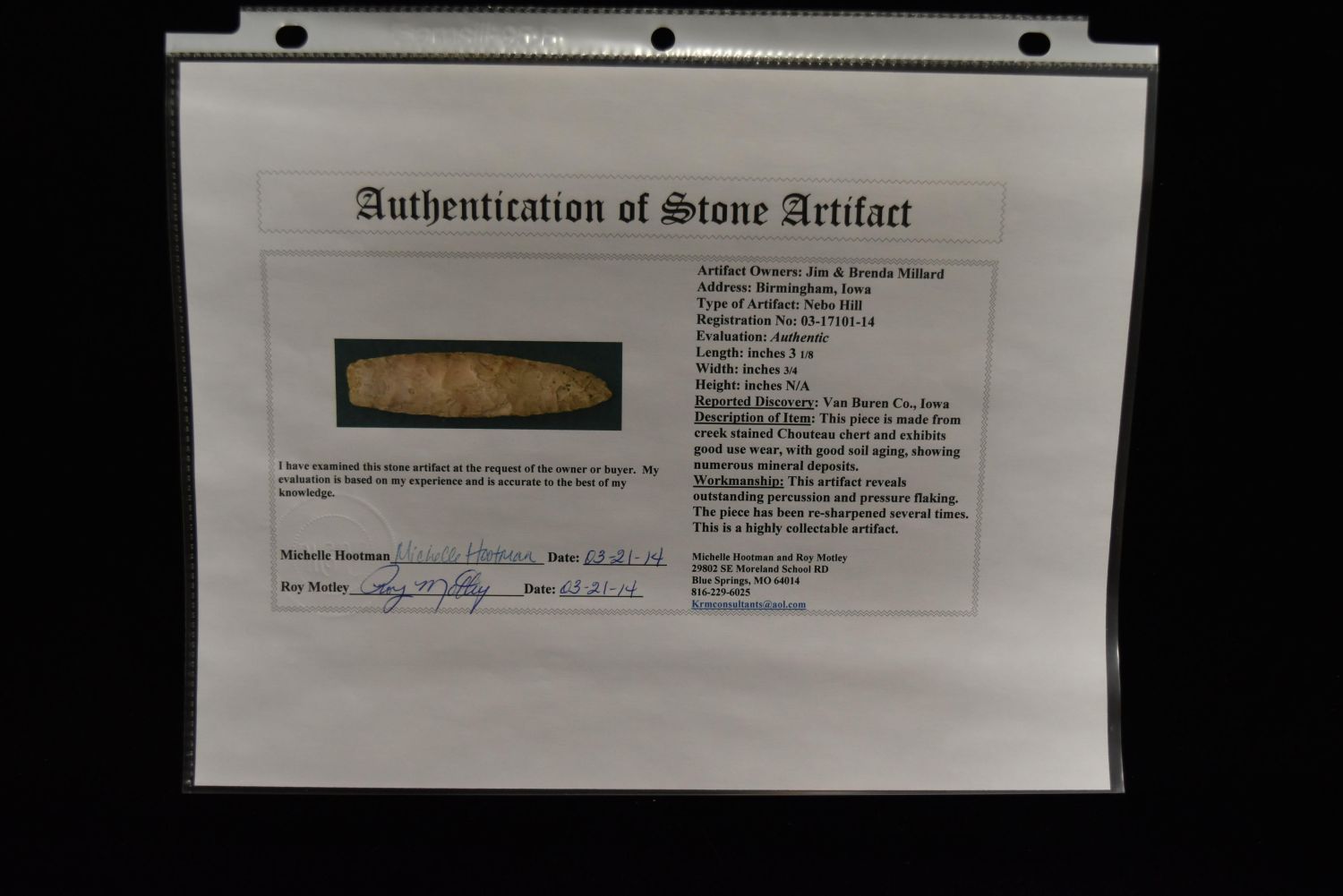 3 1/8" Nebo Hill Point, Motley COA, Van Buren Co, Iowa, Ex Jim Millard, Native American Arrowhead, Indian Artifact