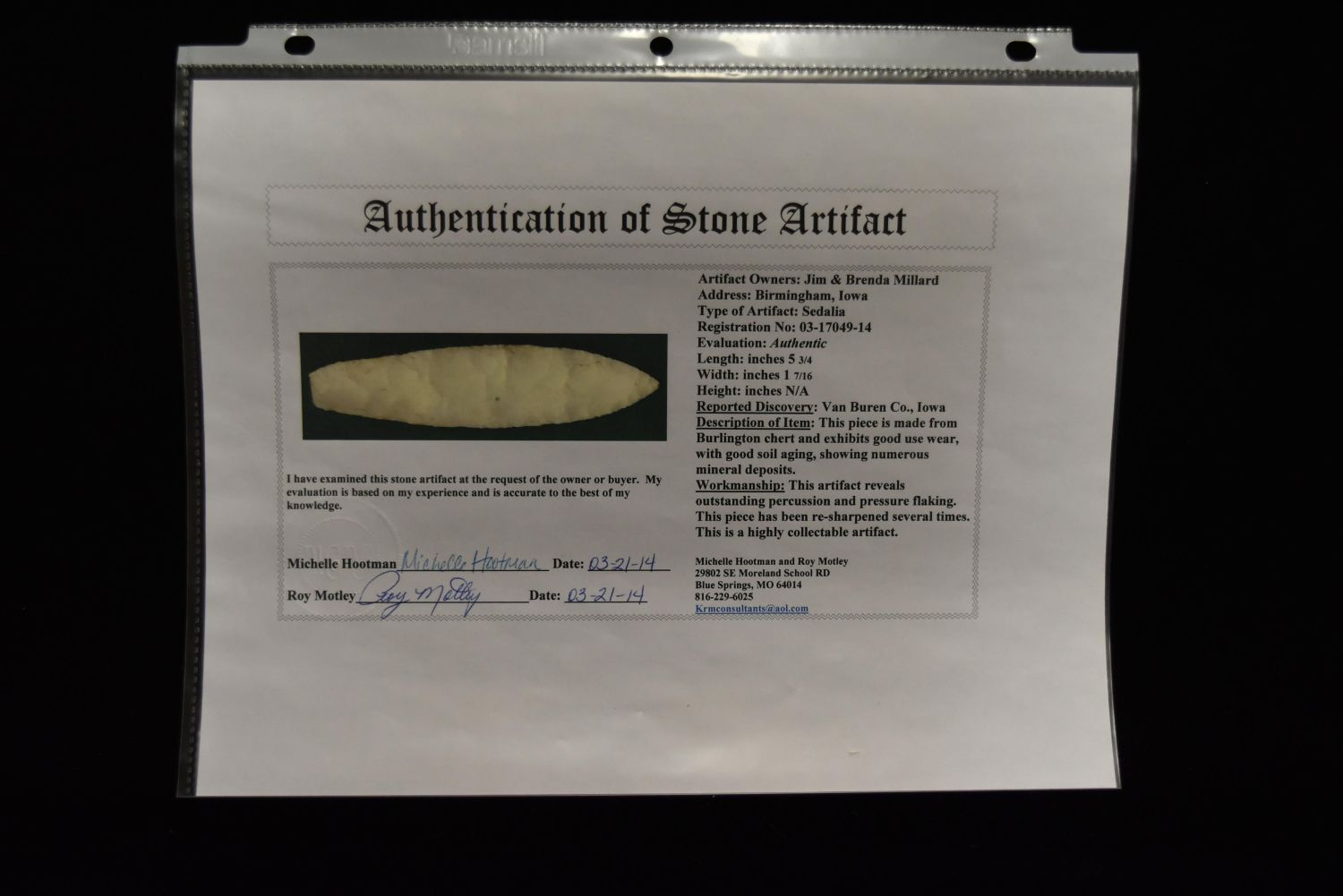 5 3/4" Outstanding Sedalia Point, Motley COA, Van Buren Co, Iowa, Amazing Shape, Ex Jim Millard, Native American Arrowhead, Indian Artifact