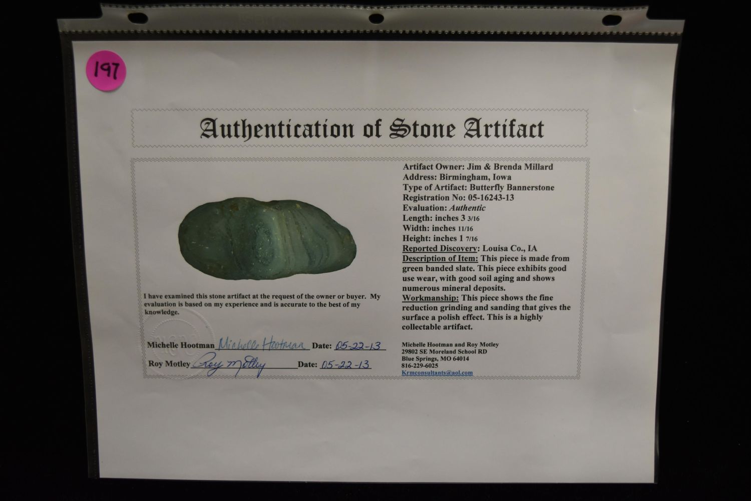 3 3/16" Butterfly Bannerstone, Motley COA, Bennett COA, Louisa Co, Iowa, Nice Color, Native American Arrowhead, Indian Artifact