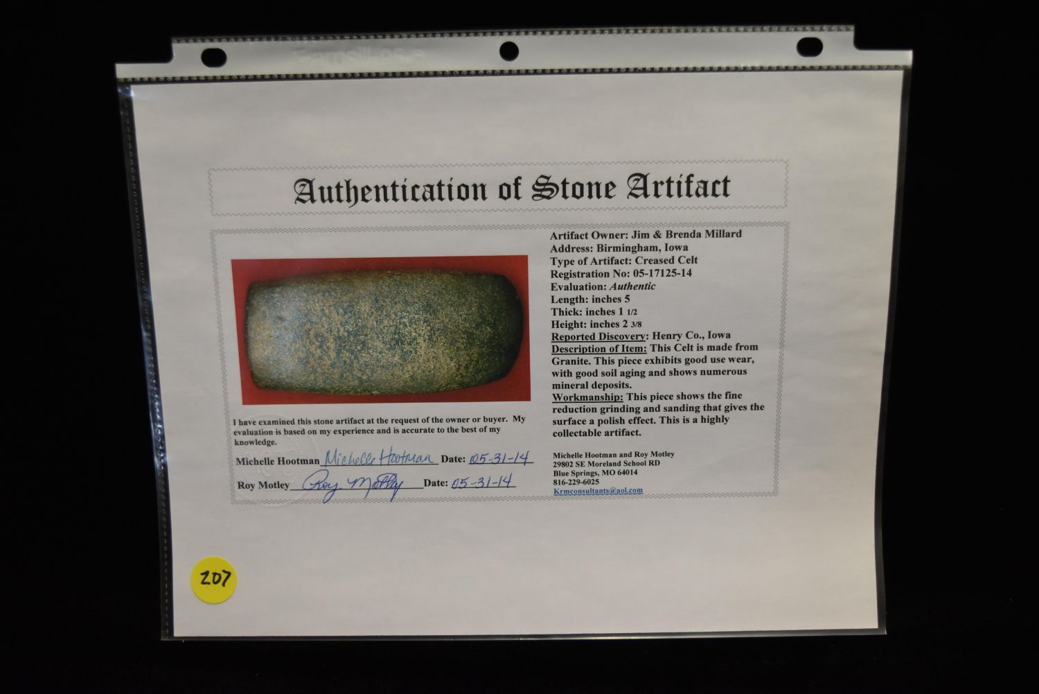 5" Black Sand Culture Creased Celt, Motley COA, Henry Co, Iowa, Great Form and Use From, Native American Arrowhead, Indian Artifact