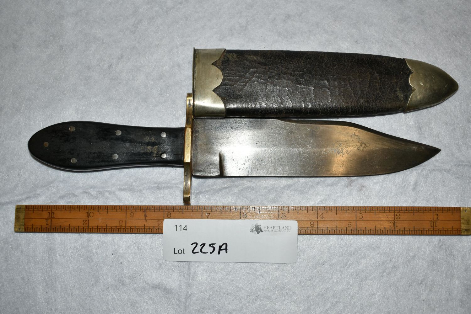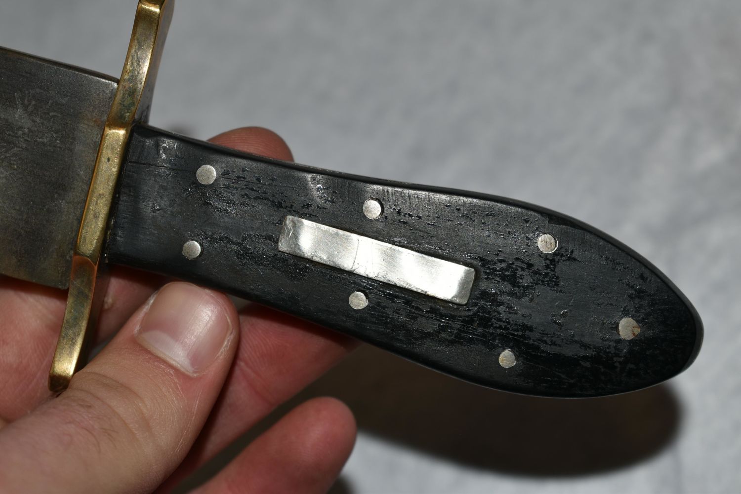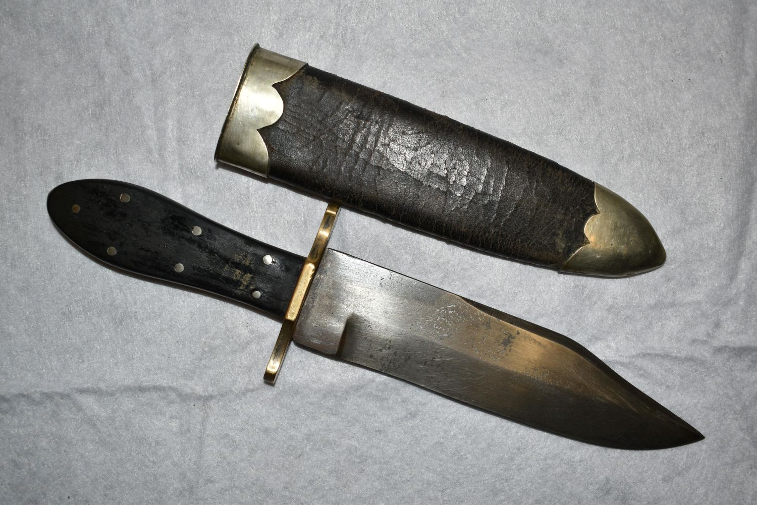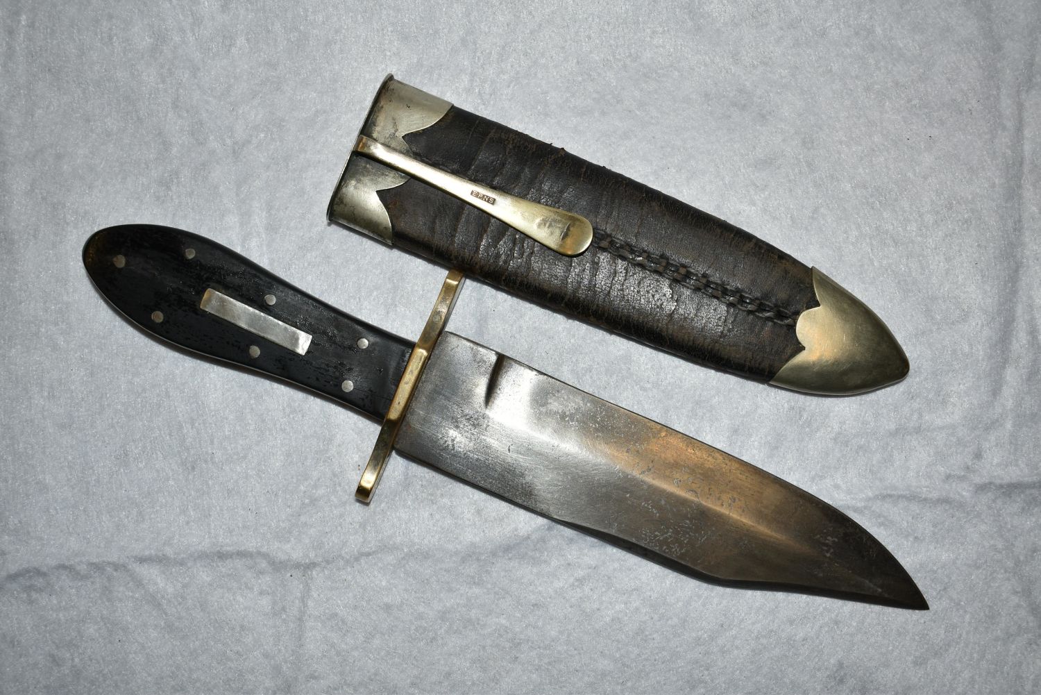 American Bowie Knife, Ebony Semi Coffin Shaped Handle, Heavy Brass Crossguard, Silver Escutcheon & 7 Pins, 6 1/2" Blade, 1 3/4" Wide, 3 1/2" Crescent Back Clip & 2" Worked Back Single Edged Blade, German Silver Mounted, 1850, Leather Sheath with Spoon Handle Belt Hook
