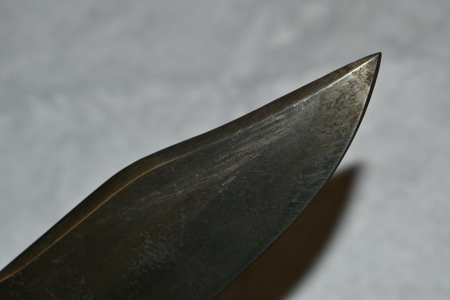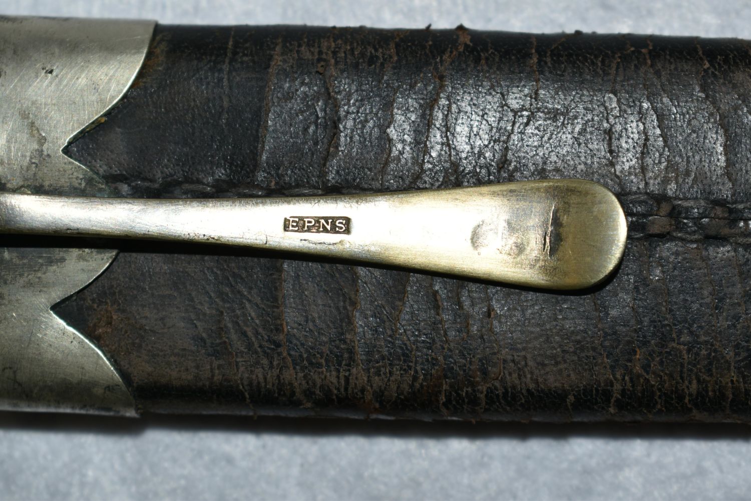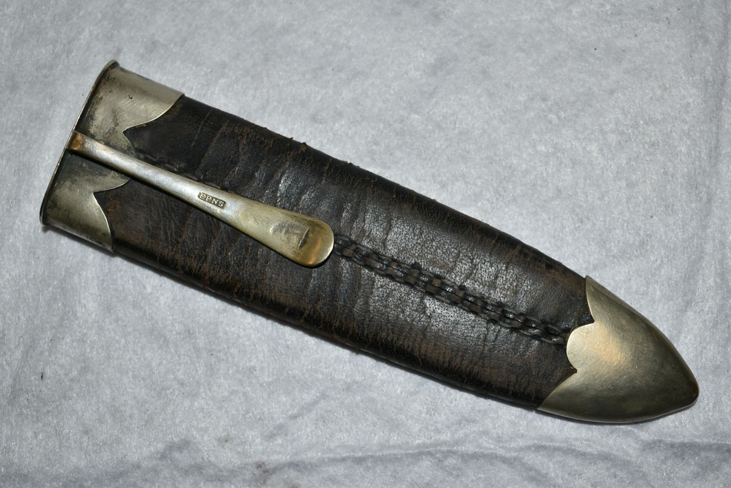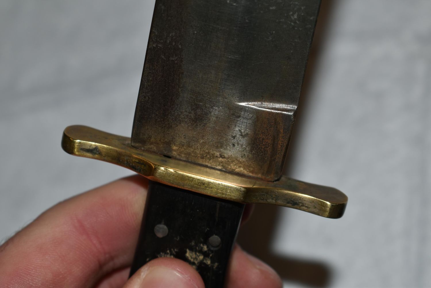 American Bowie Knife, Ebony Semi Coffin Shaped Handle, Heavy Brass Crossguard, Silver Escutcheon & 7 Pins, 6 1/2" Blade, 1 3/4" Wide, 3 1/2" Crescent Back Clip & 2" Worked Back Single Edged Blade, German Silver Mounted, 1850, Leather Sheath with Spoon Handle Belt Hook
