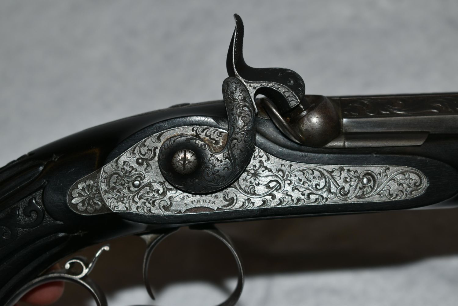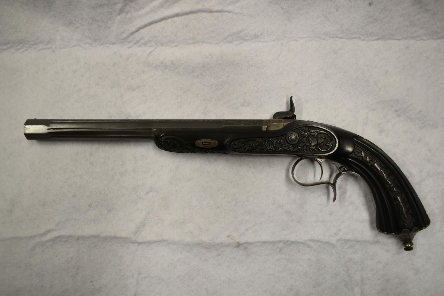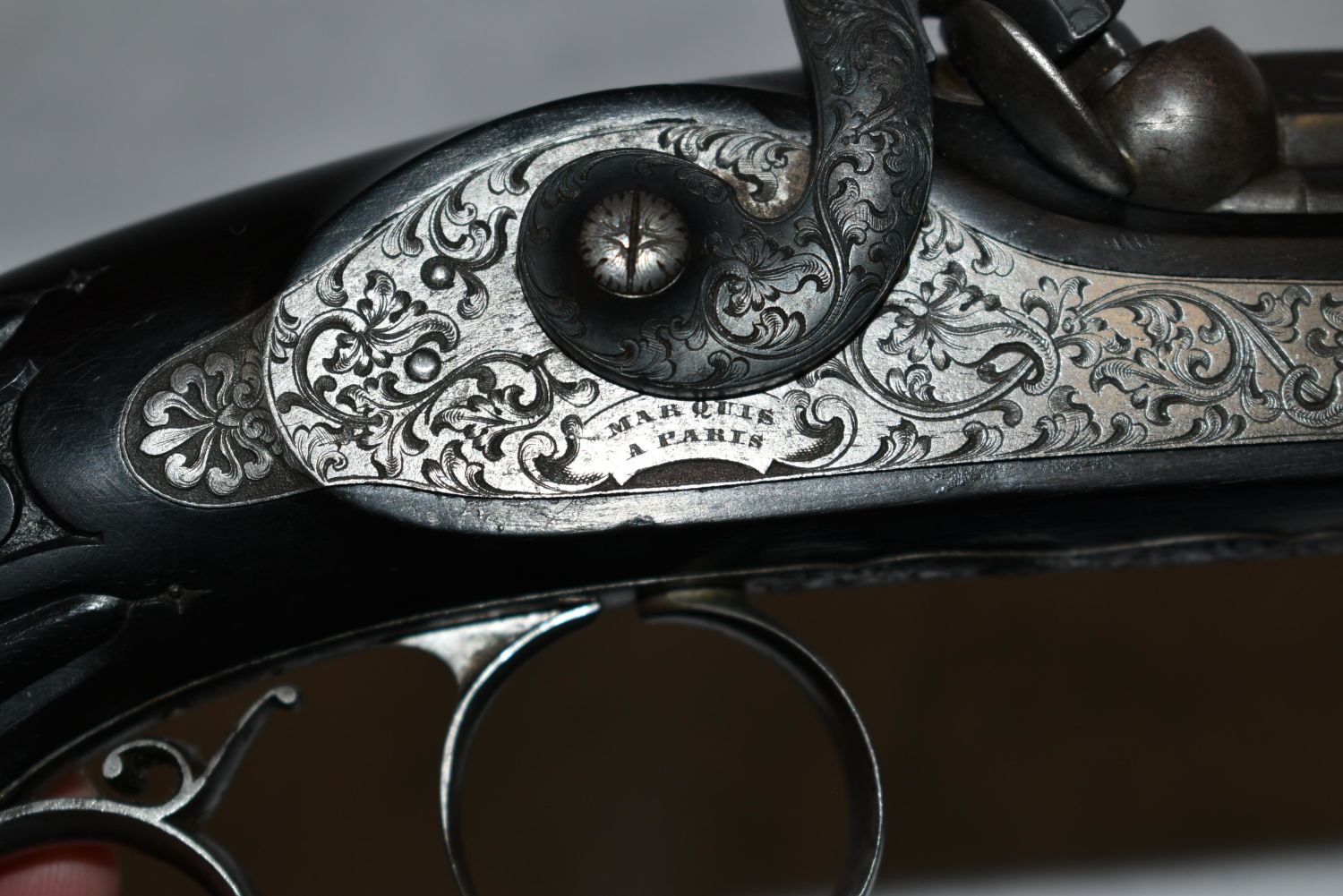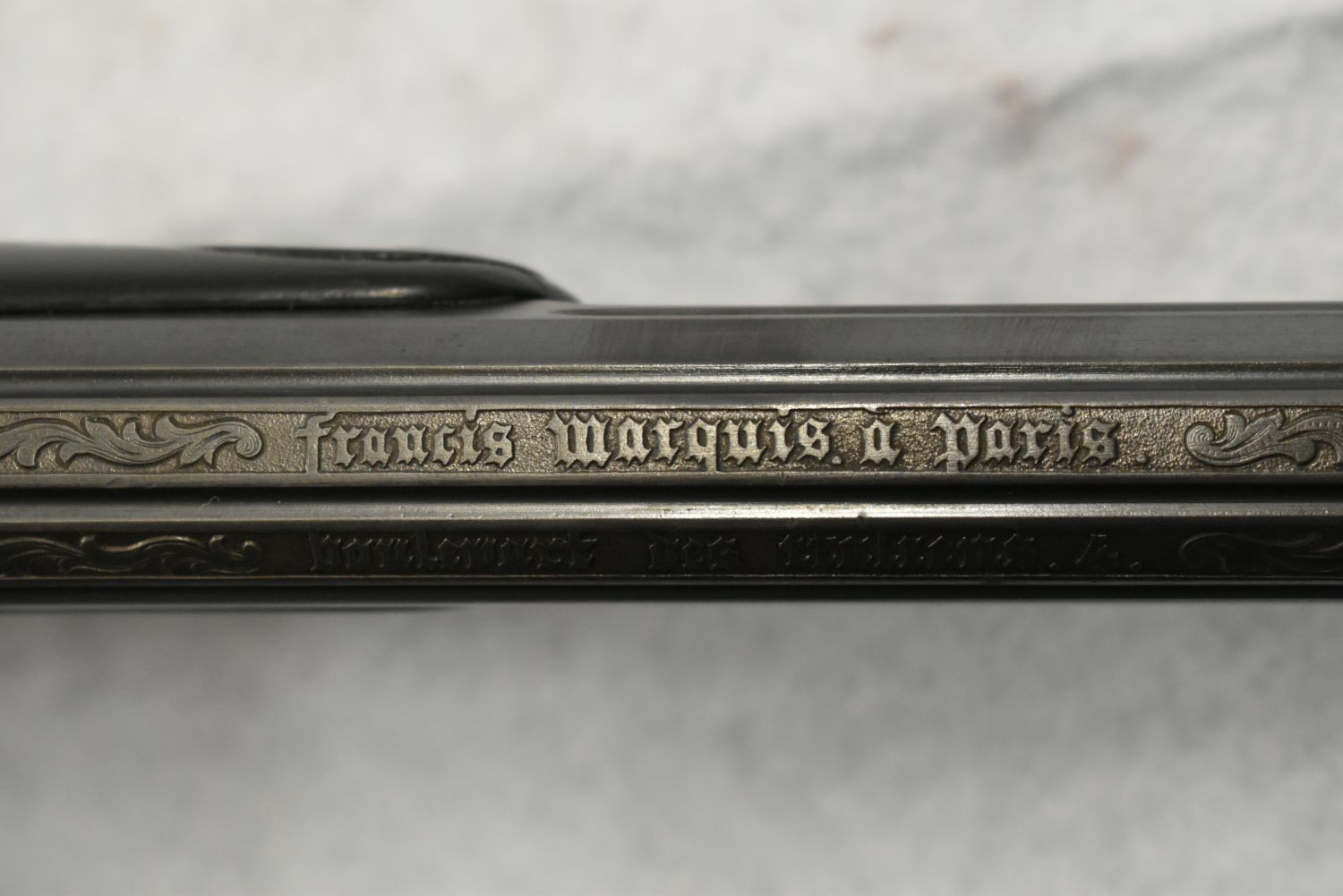 Engraved and Carved Francis Marquis of Paris Percussion Dueling/Target Pistol, Francis Marquis’ shop in Paris was established in 1848. The barrel has 1853 on the bottom, a bright bead/post front sight, flutes along the midsection, "Francis Marquis a Paris" etched on upper left, "boulevard des italiens 4" etched on upper right and scroll patterns. A fine notch rear sight on the upper tang. Intricate leafy scroll engraving on lock which is marked "Marquis/a Paris" in a banner below hammer. The other furniture has coordinating engraving and the stock also has incised leafy scroll carving. "85" on bottom of the barrel, the breech plug and wedge, wedge staple has "2"