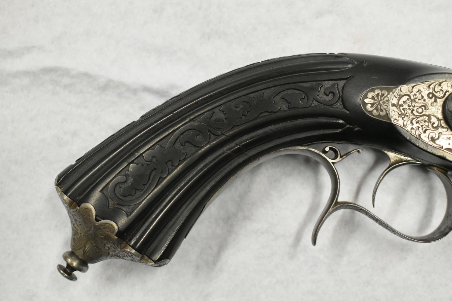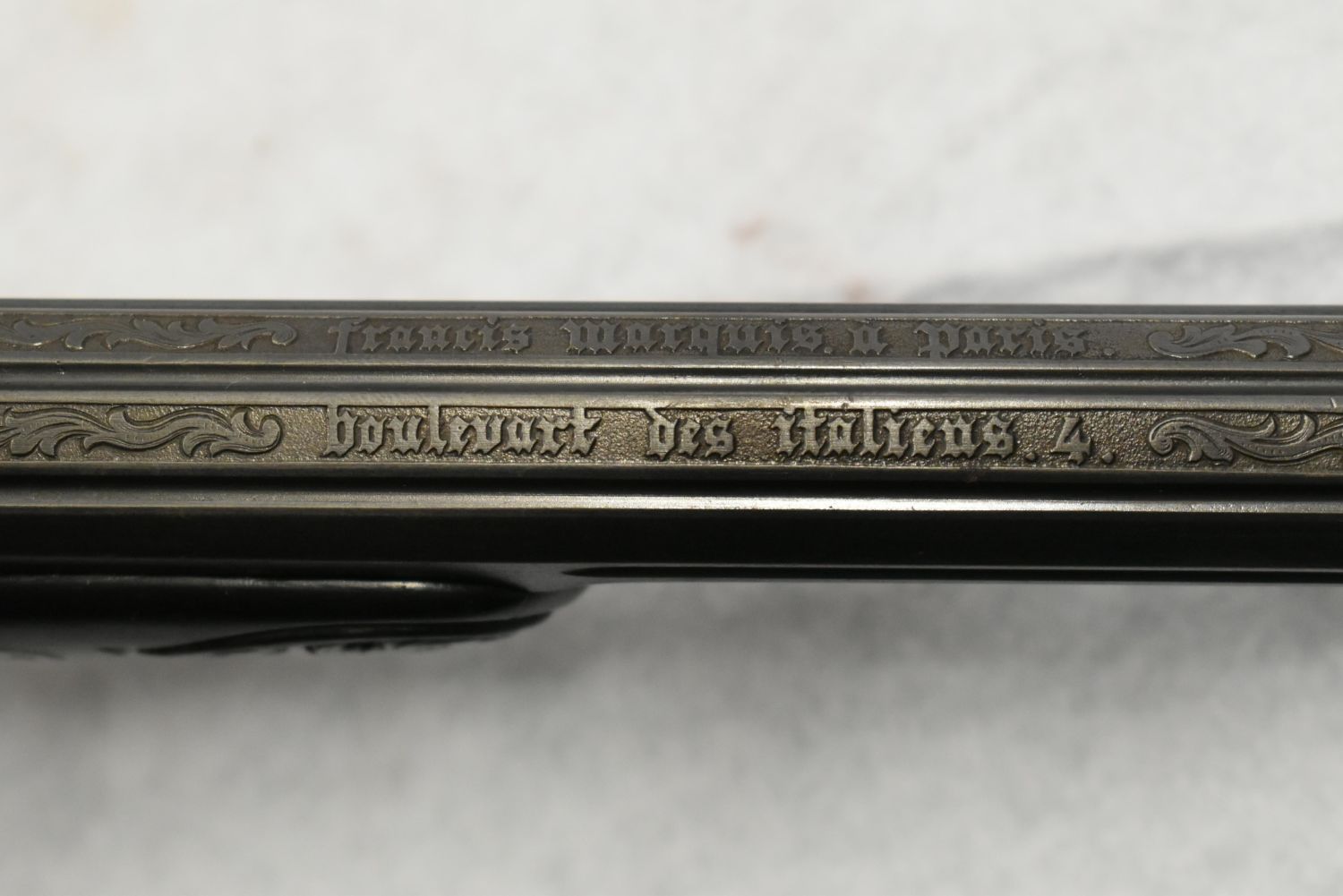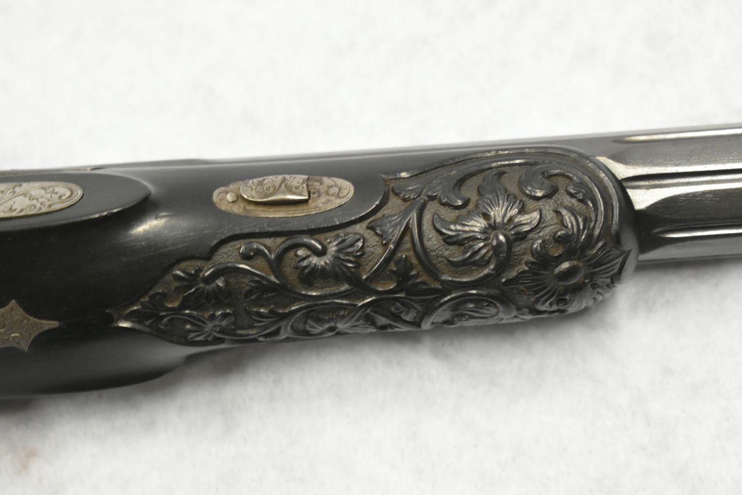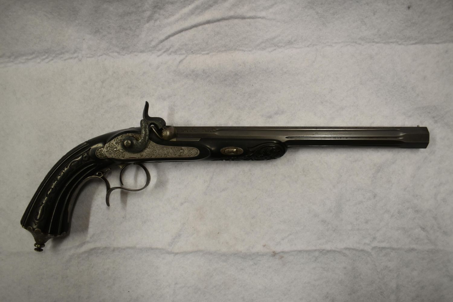 Engraved and Carved Francis Marquis of Paris Percussion Dueling/Target Pistol, Francis Marquis’ shop in Paris was established in 1848. The barrel has 1853 on the bottom, a bright bead/post front sight, flutes along the midsection, "Francis Marquis a Paris" etched on upper left, "boulevard des italiens 4" etched on upper right and scroll patterns. A fine notch rear sight on the upper tang. Intricate leafy scroll engraving on lock which is marked "Marquis/a Paris" in a banner below hammer. The other furniture has coordinating engraving and the stock also has incised leafy scroll carving. "85" on bottom of the barrel, the breech plug and wedge, wedge staple has "2"