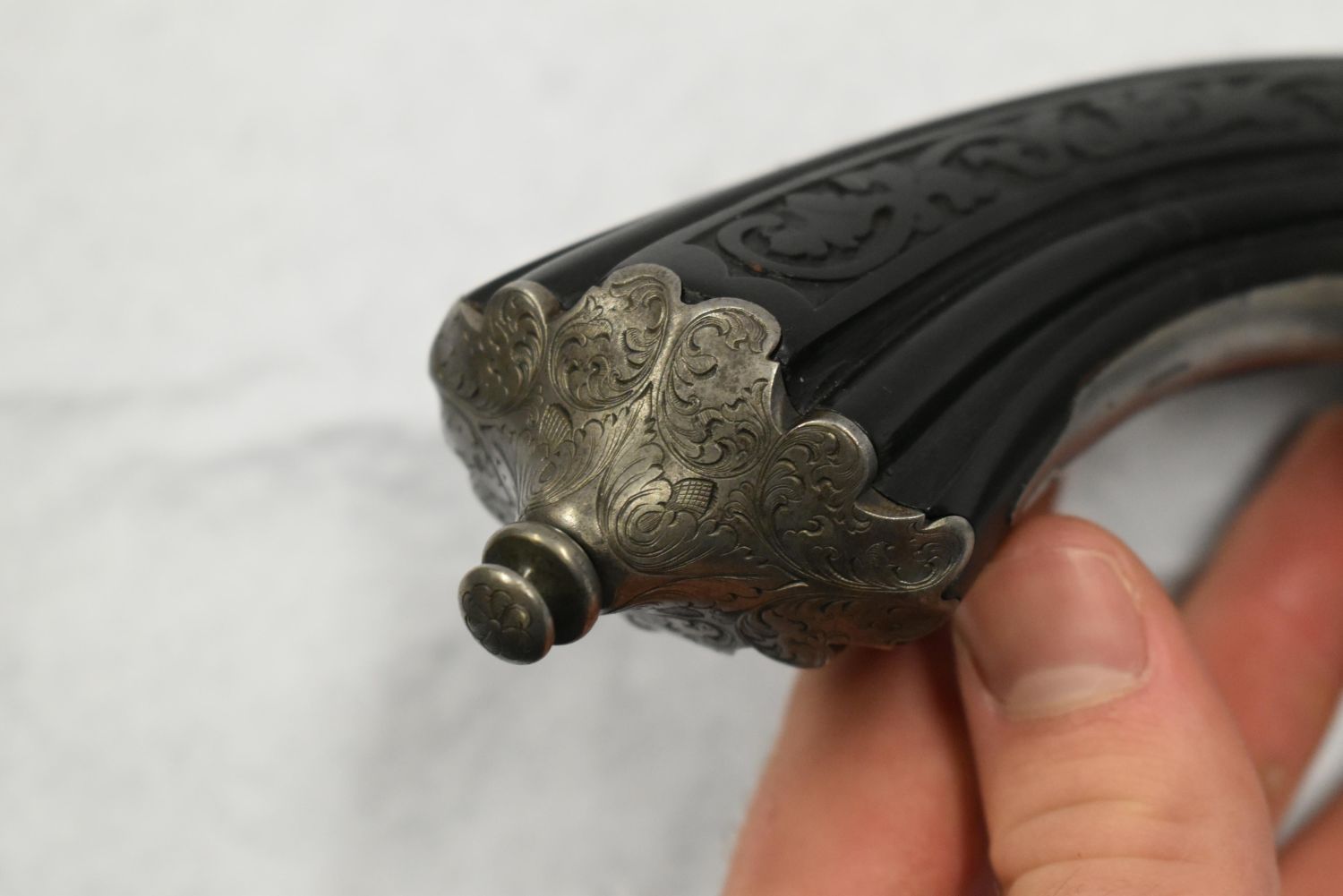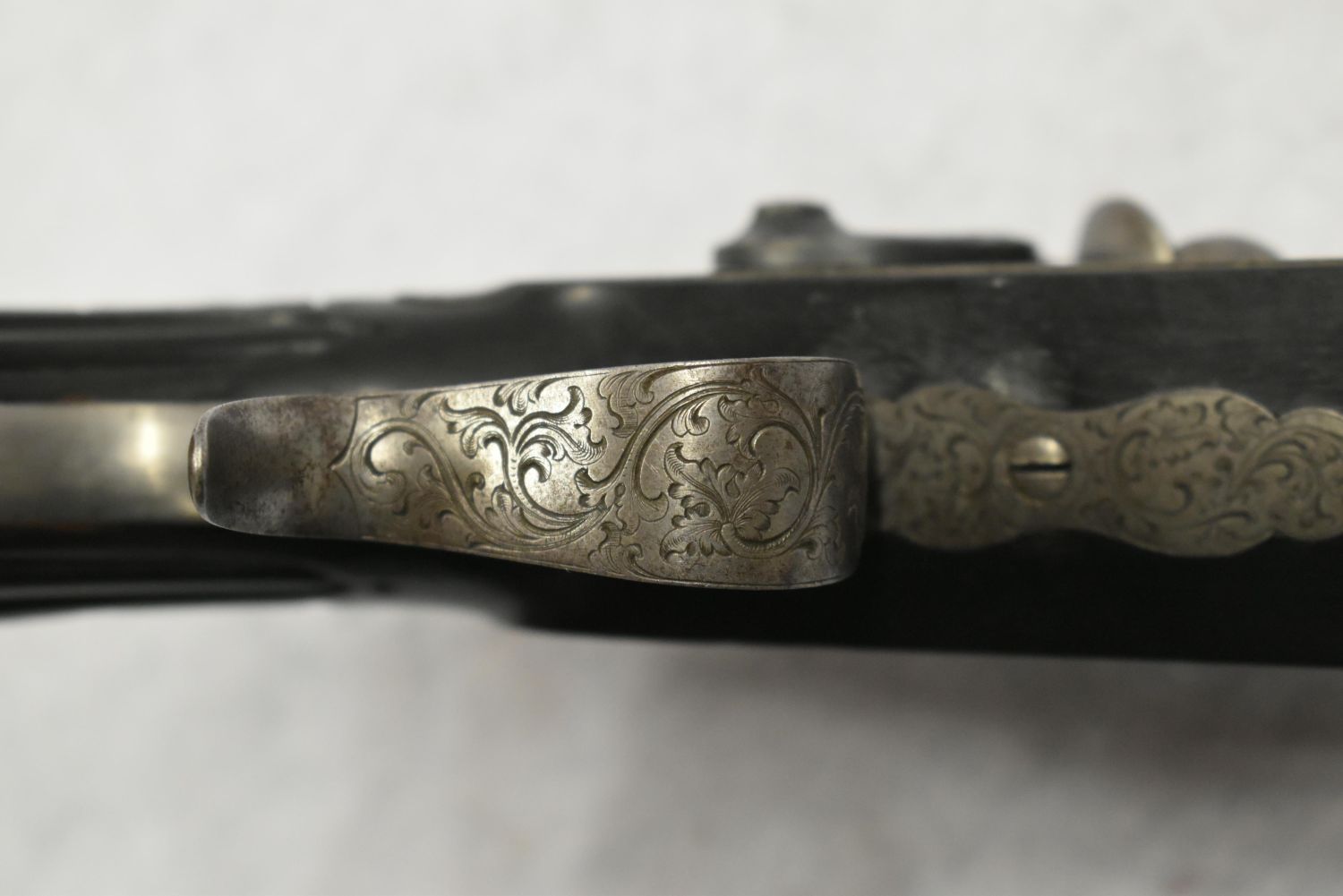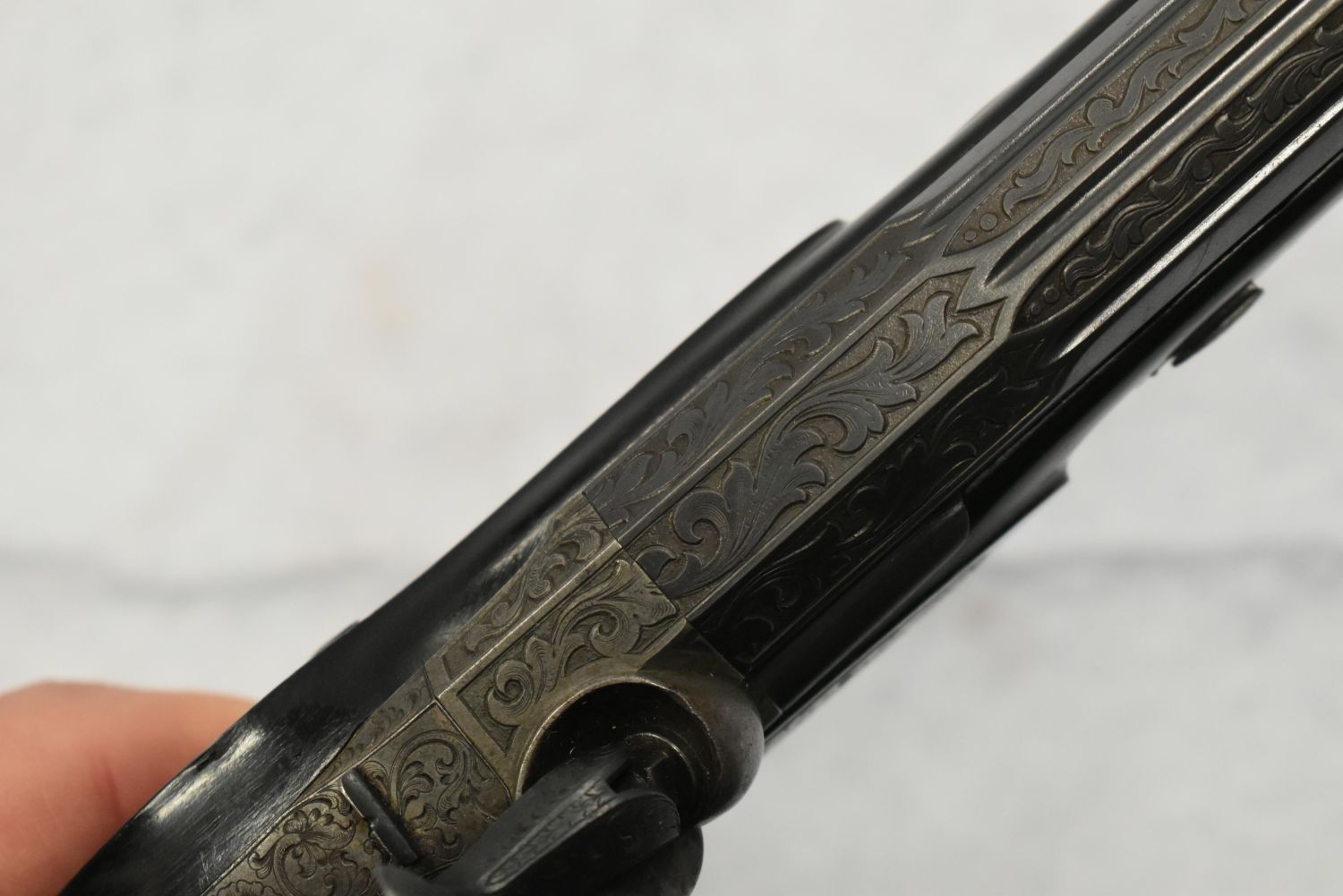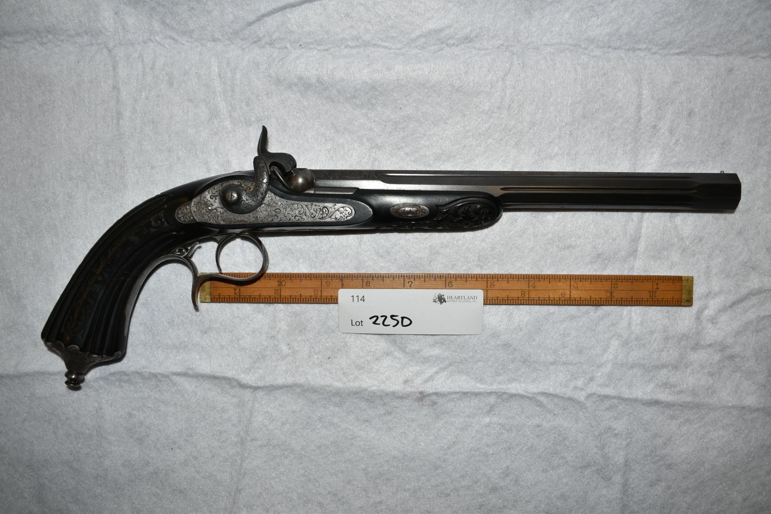 Engraved and Carved Francis Marquis of Paris Percussion Dueling/Target Pistol, Francis Marquis’ shop in Paris was established in 1848. The barrel has 1853 on the bottom, a bright bead/post front sight, flutes along the midsection, "Francis Marquis a Paris" etched on upper left, "boulevard des italiens 4" etched on upper right and scroll patterns. A fine notch rear sight on the upper tang. Intricate leafy scroll engraving on lock which is marked "Marquis/a Paris" in a banner below hammer. The other furniture has coordinating engraving and the stock also has incised leafy scroll carving. "85" on bottom of the barrel, the breech plug and wedge, wedge staple has "2"