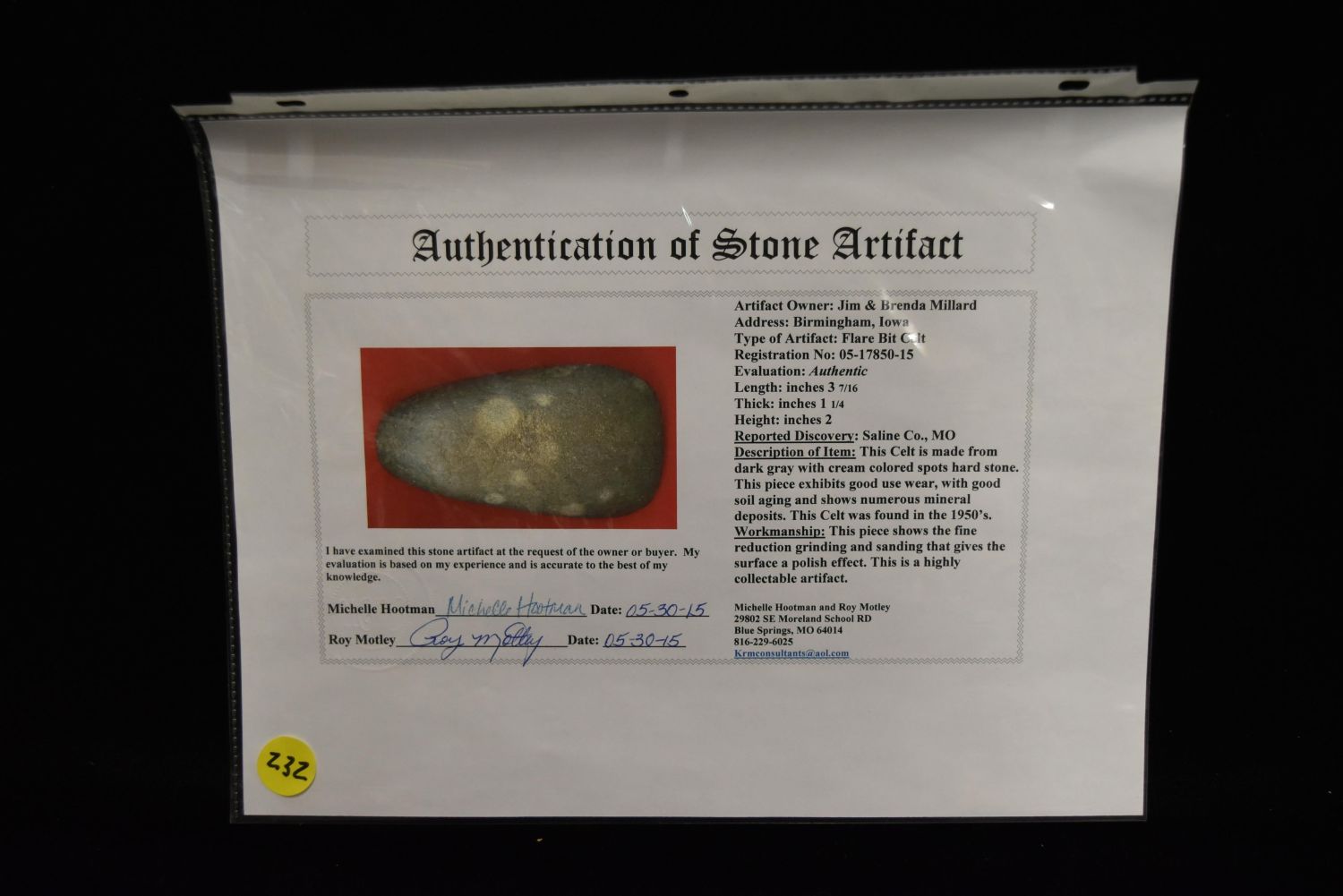3 7/16" Flare Bit Celt, Motley COA, Saline Co, Missouri, Nice Color, Ex Jim Millard, Native American Arrowhead, Indian Artifact