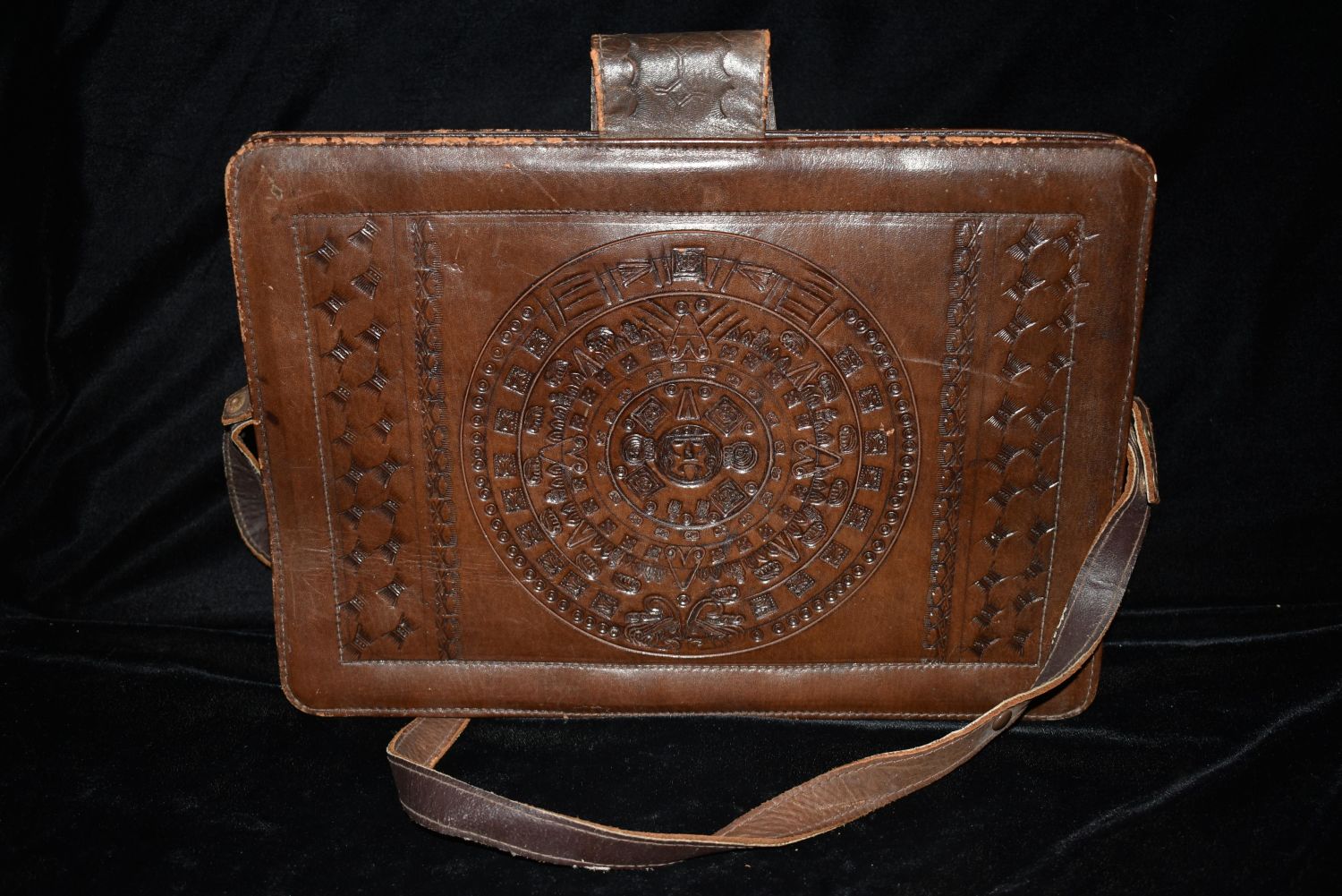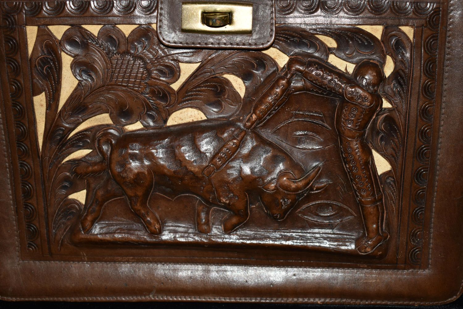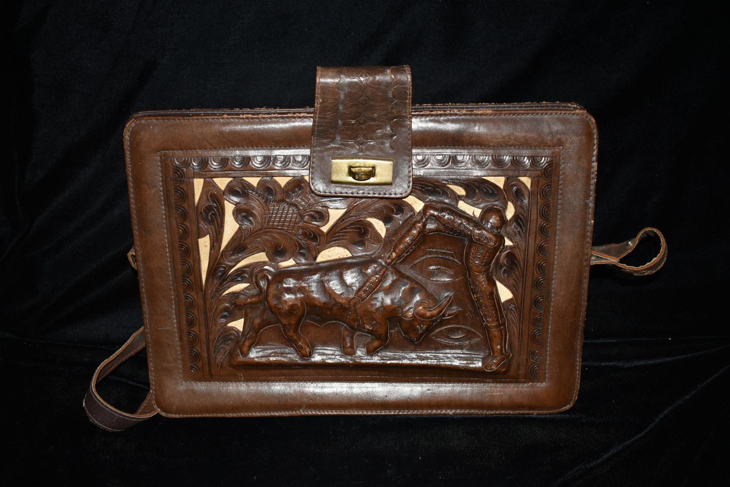 Embossed Leather Mexican Purse, Bull Fighting Scene on One Side, Aztec or Mayan Symbol on Reverse, High Quality Leather Product, Probably From the 1950’s, 14" long x 10" high