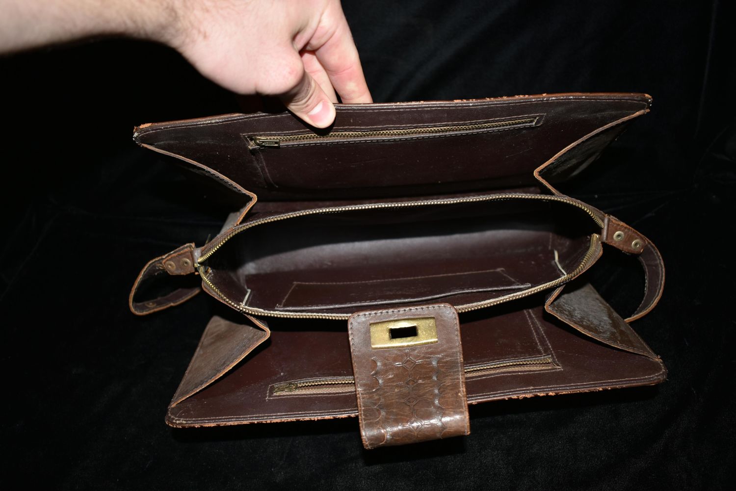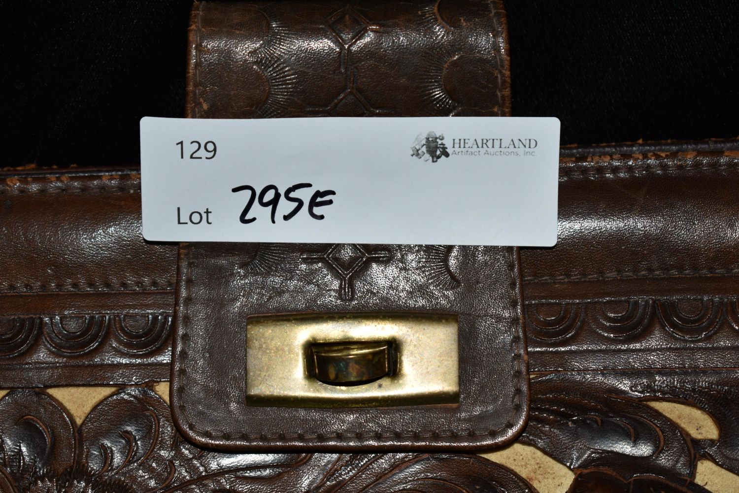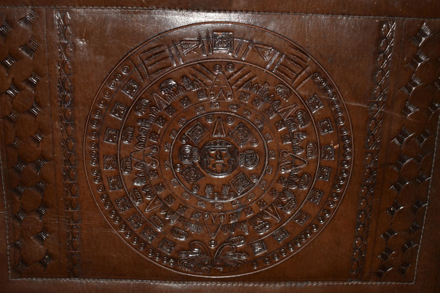 Embossed Leather Mexican Purse, Bull Fighting Scene on One Side, Aztec or Mayan Symbol on Reverse, High Quality Leather Product, Probably From the 1950’s, 14" long x 10" high
