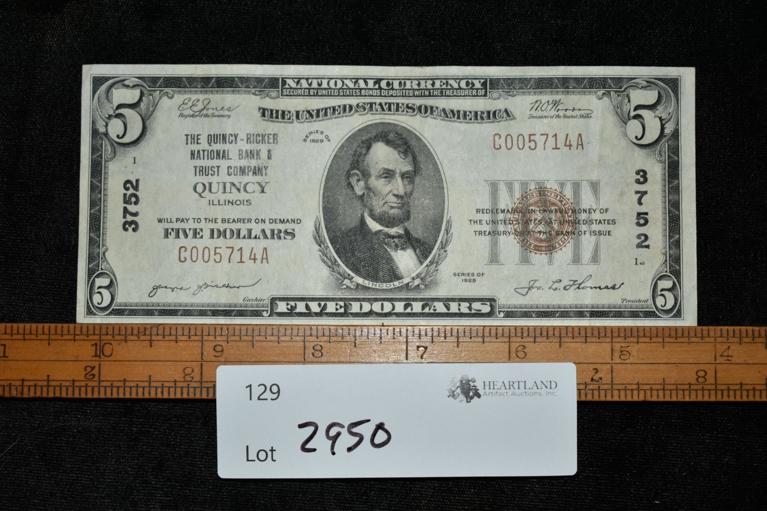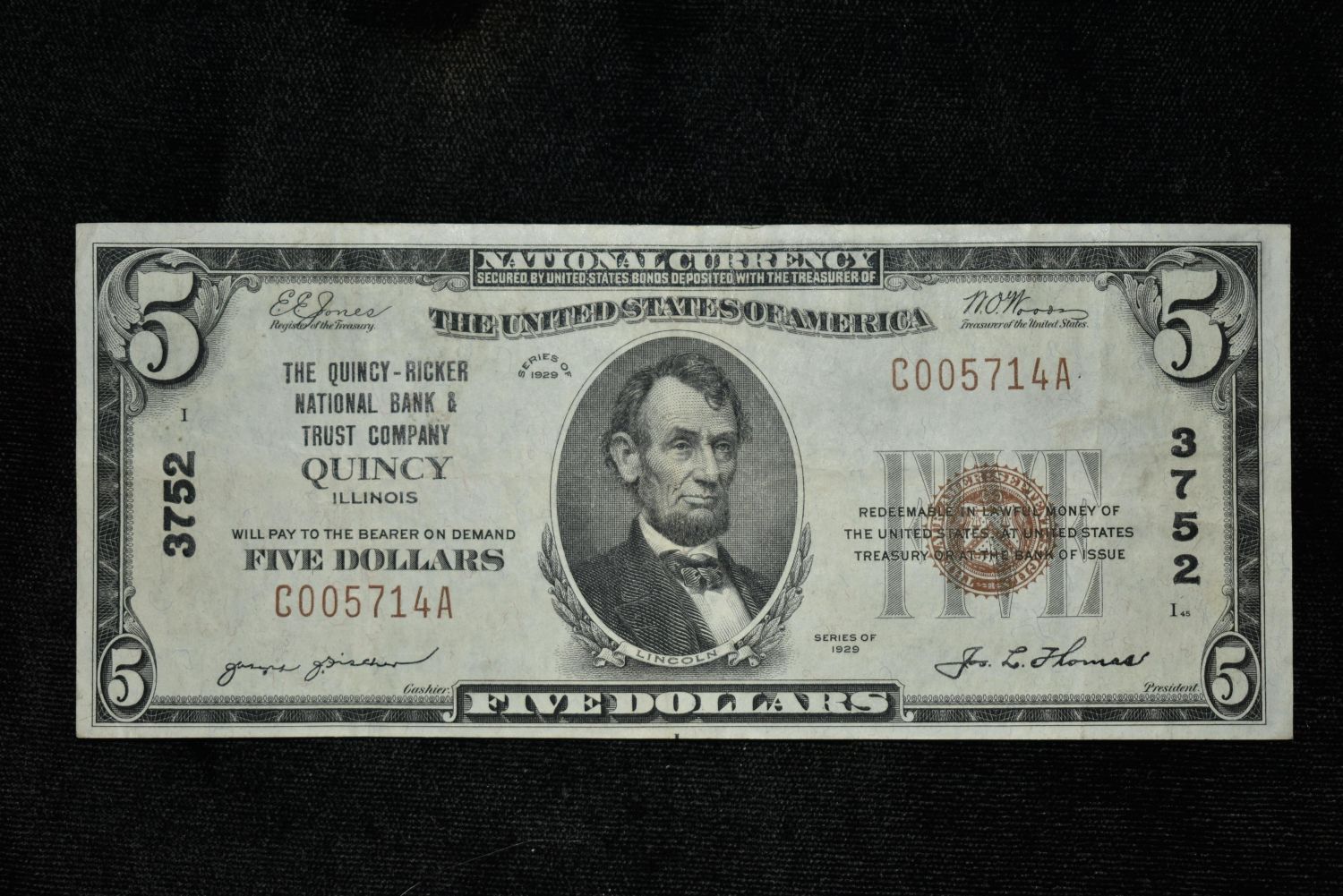 5 Dollar Bill, 1929, Quincy Ricker National Bank Marking, Excellent Condition Condition: 100% Guaranteed Authentic via our Return Policy & Found on Private Property