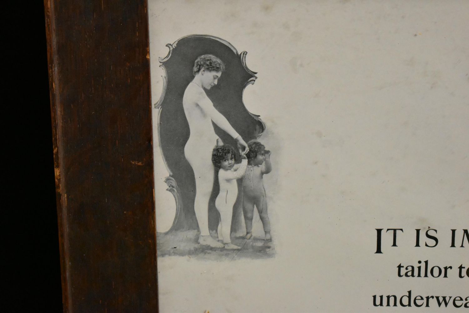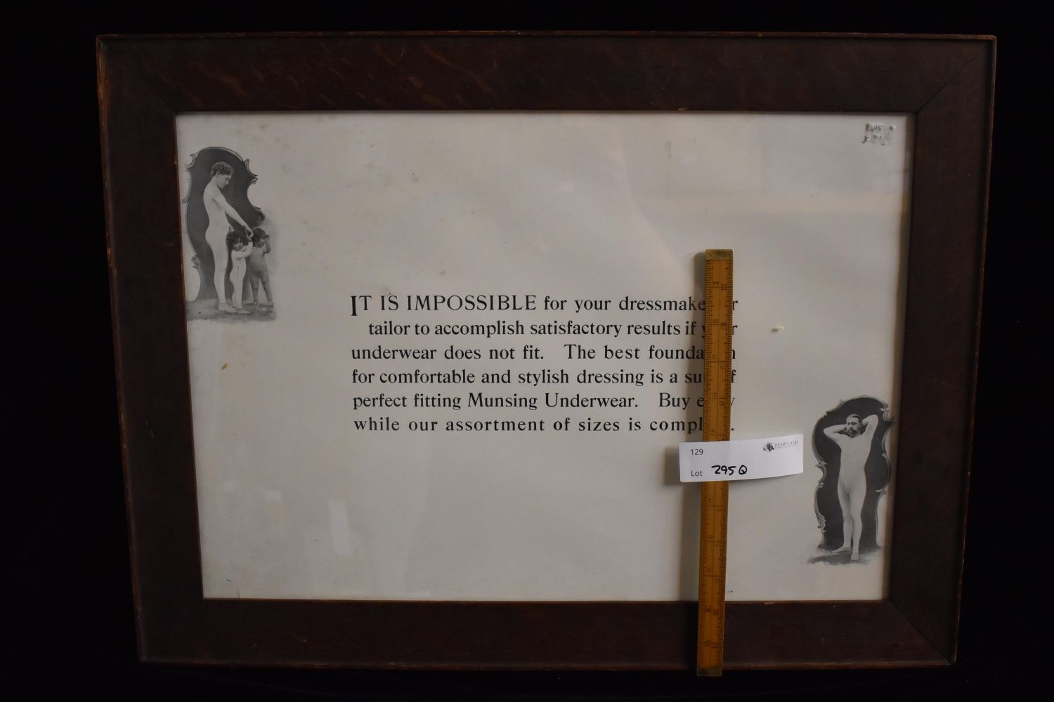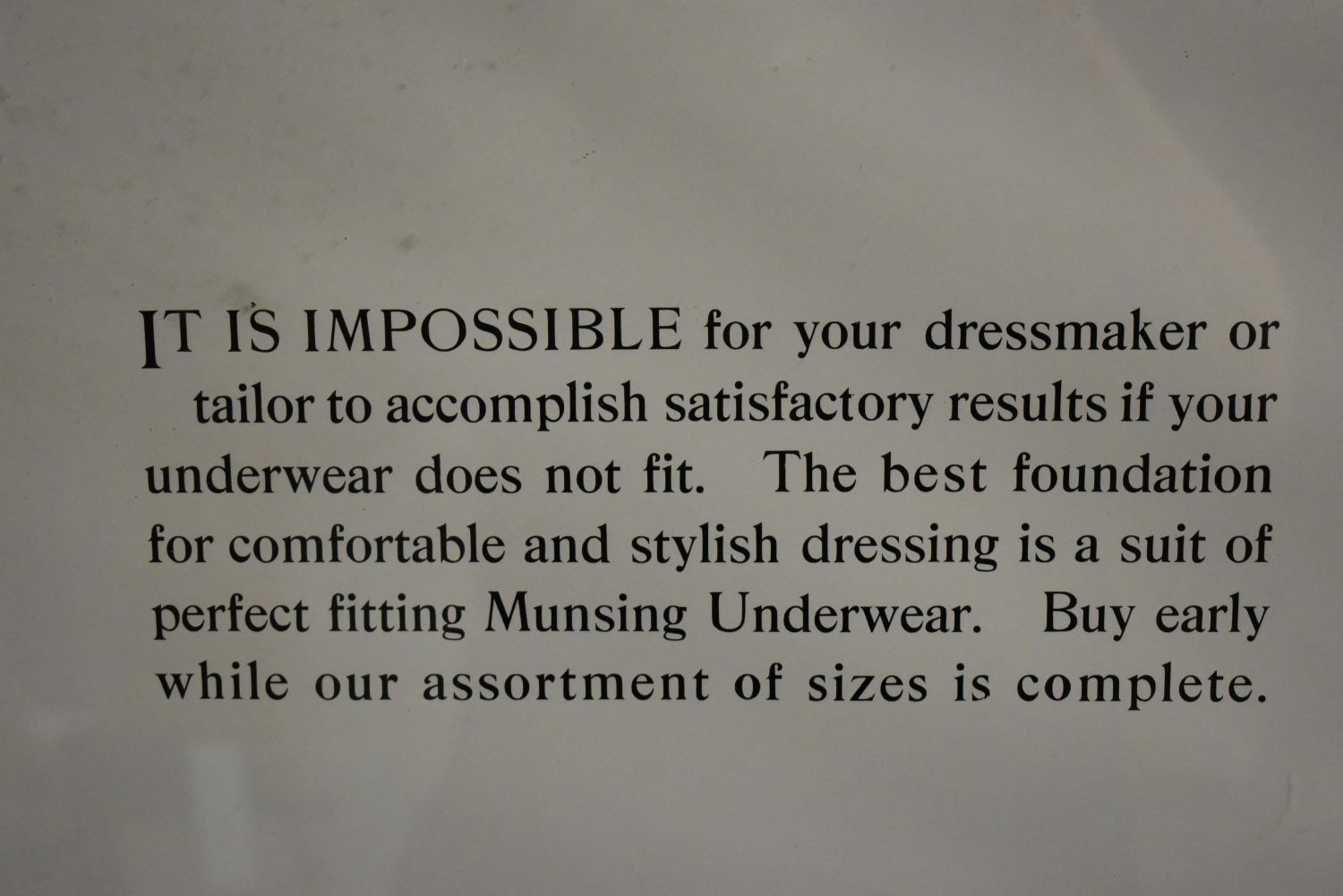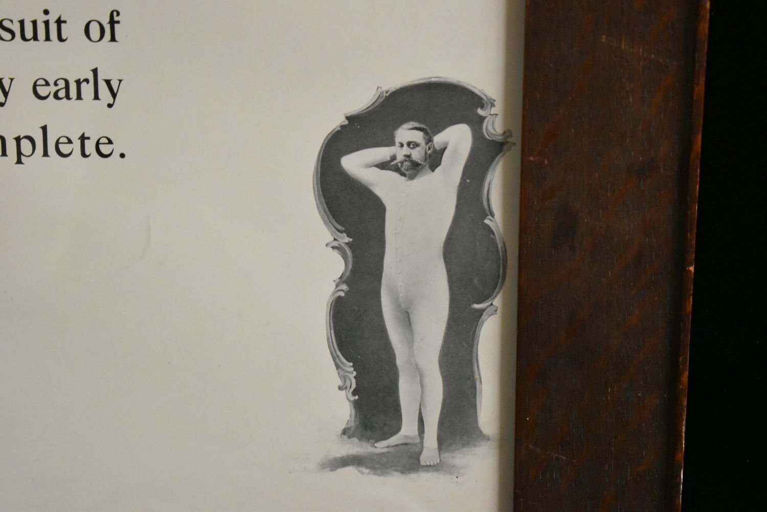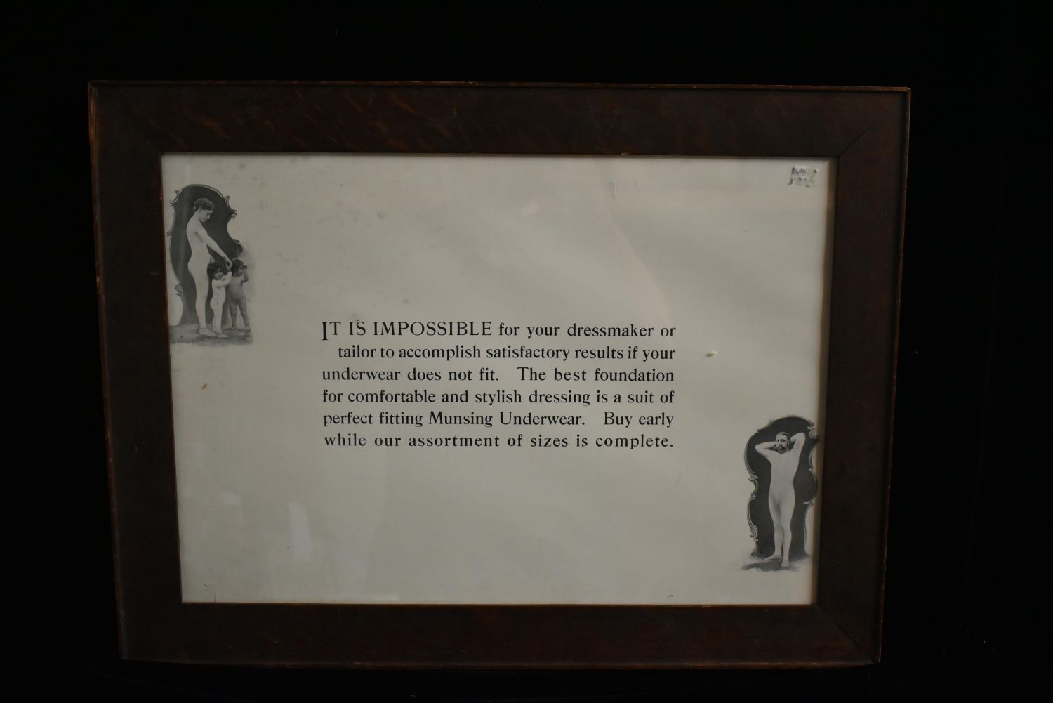 Munsing Underwear Advertisement from 1920’s, Features one piece underwear graphs. In original quarter sawn oak frame. Neat photos of man, woman and child in one piece underwear. Measures 25 1/2" x 17 1/2"