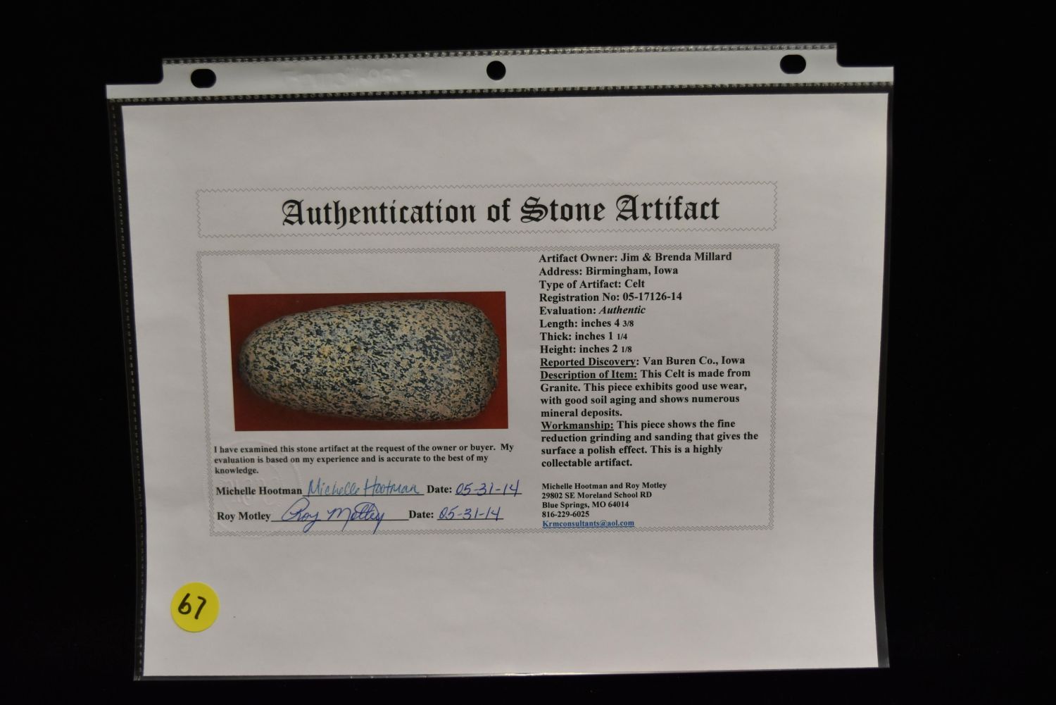 4 1/2" Celt, Motley COA, Van Buren Co, Iowa, Ex Jim