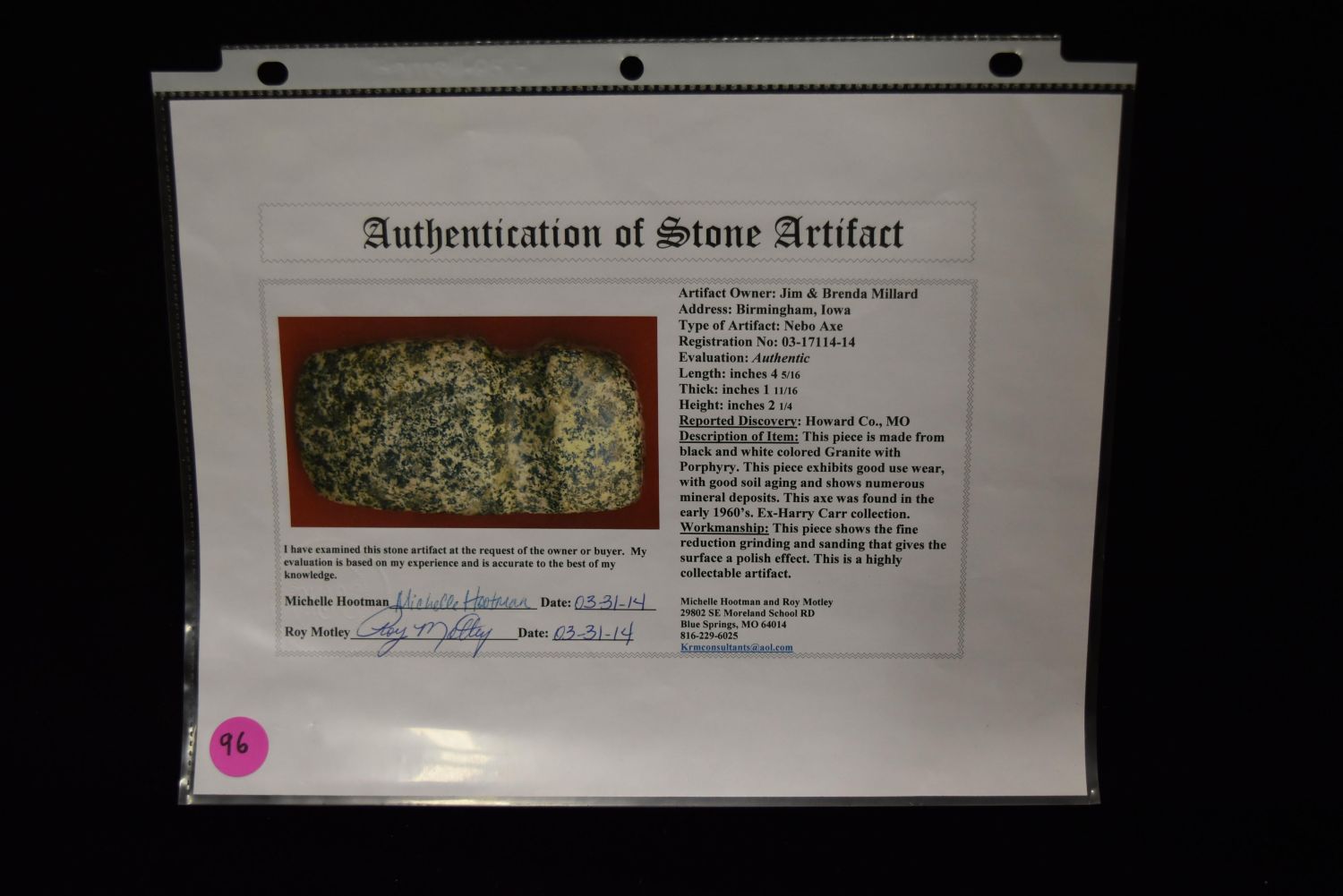 4 5/16" 3/4 Groove Porphyry Nebo Axe, Motley COA, Howard Co, Missouri, Ex Harry Carr, Jim MIllard, Native American Arrowhead, Indian Artifact
