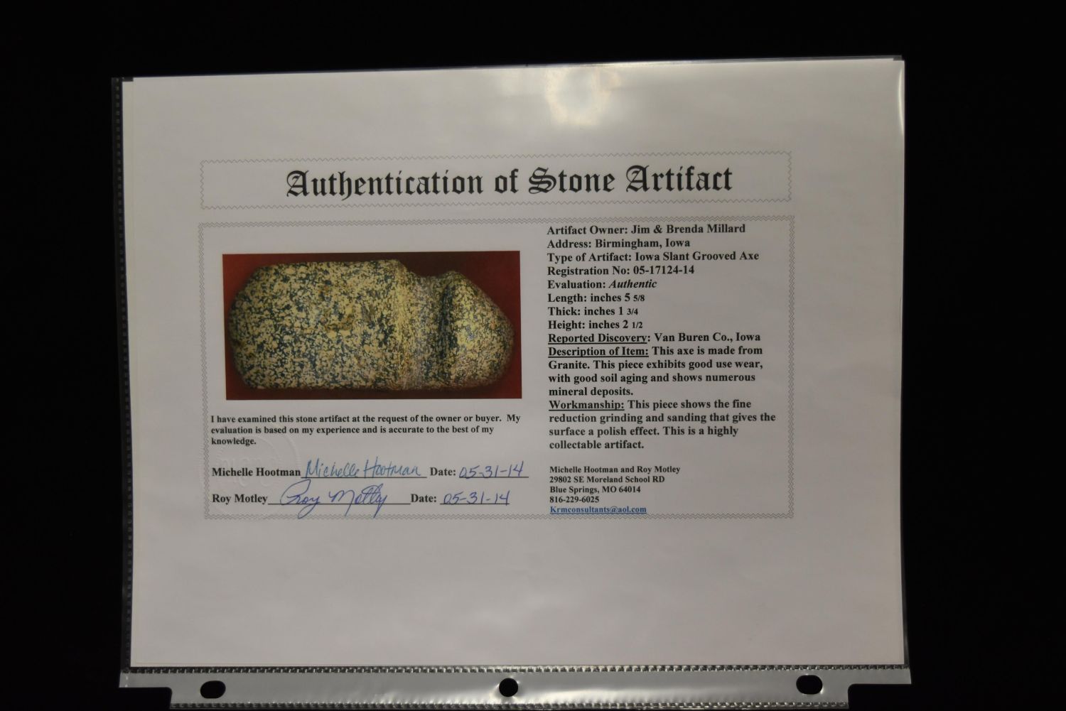 5 5/8" Iowa Slant 3/4 Groove Axe, Motley COA, Van Buren Co, Iowa, Ex Jim Millard, Native American Arrowhead, Indian Artifact