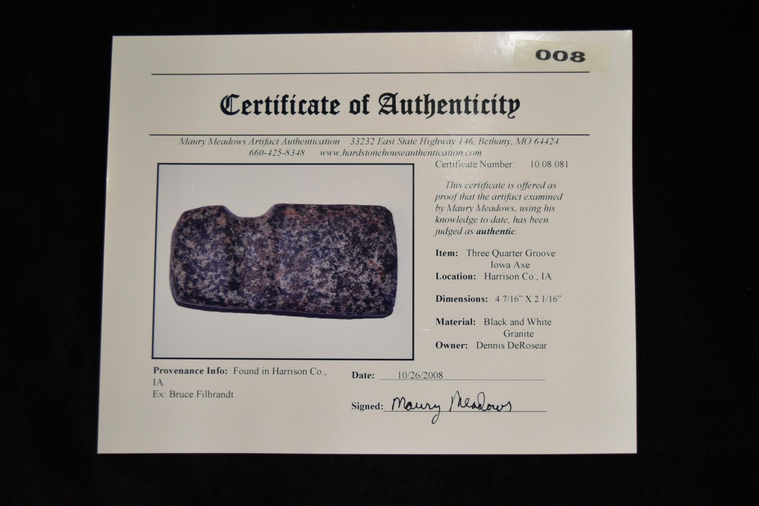 4 1/8" 3/4 Slant Groove Axe, Meadows COA, Harrison Co, Iowa, Ex Bruce Filbrandt, Dennis DeRosear, Native American Arrowhead, Indian Artifact
