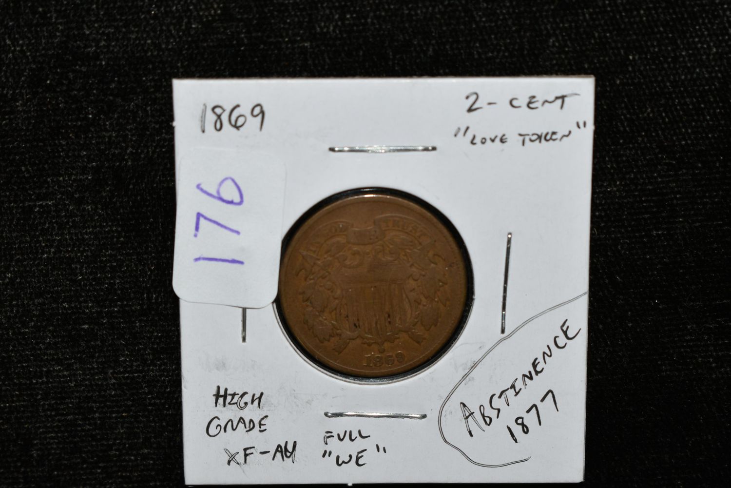 RARE 1869 TWO-CENT PIECE ABSTINENCE / LOVE TOKEN, XF-AU DETIALS! Condition: Guaranteed Authentic/Unaltered