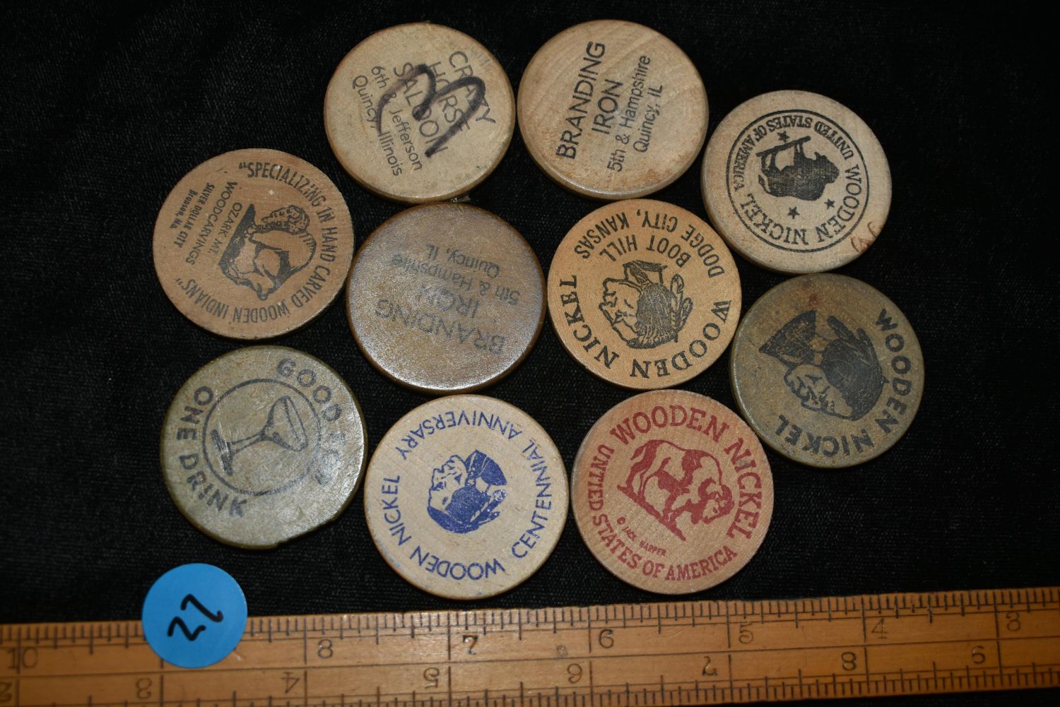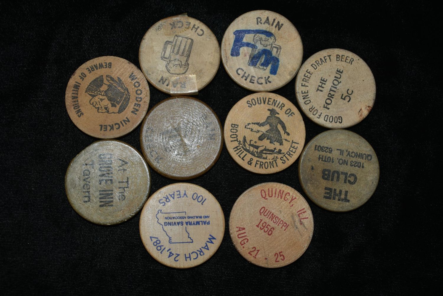 Lot of 10 Wooden Advertisiment Tokens from Quincy Illinois Condition: 100% Guaranteed Authentic via our Return Policy & Found on Private Property