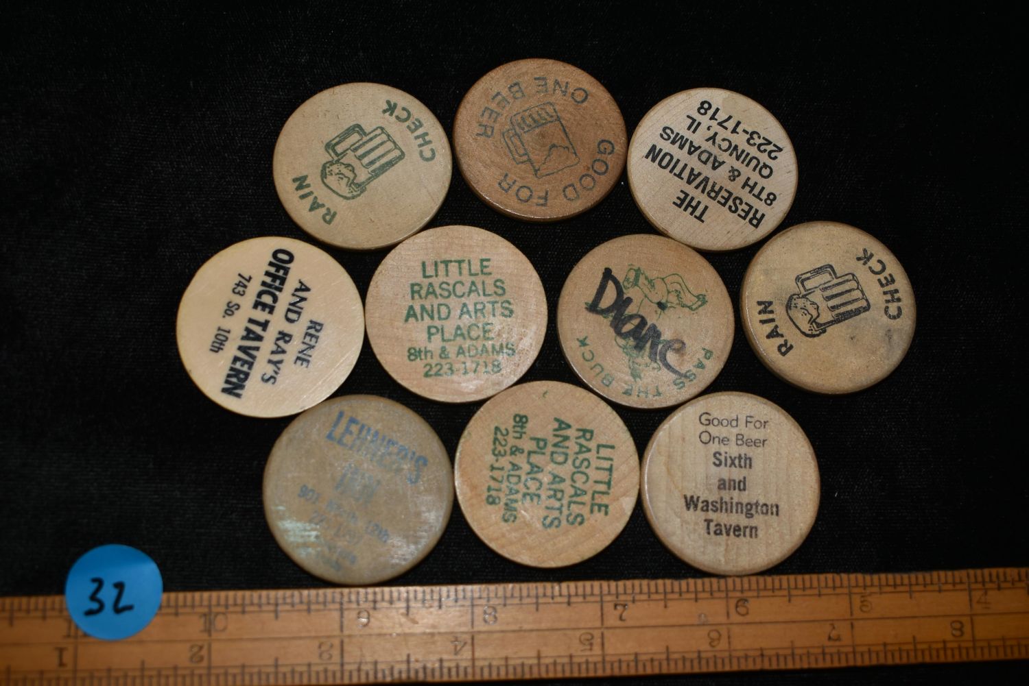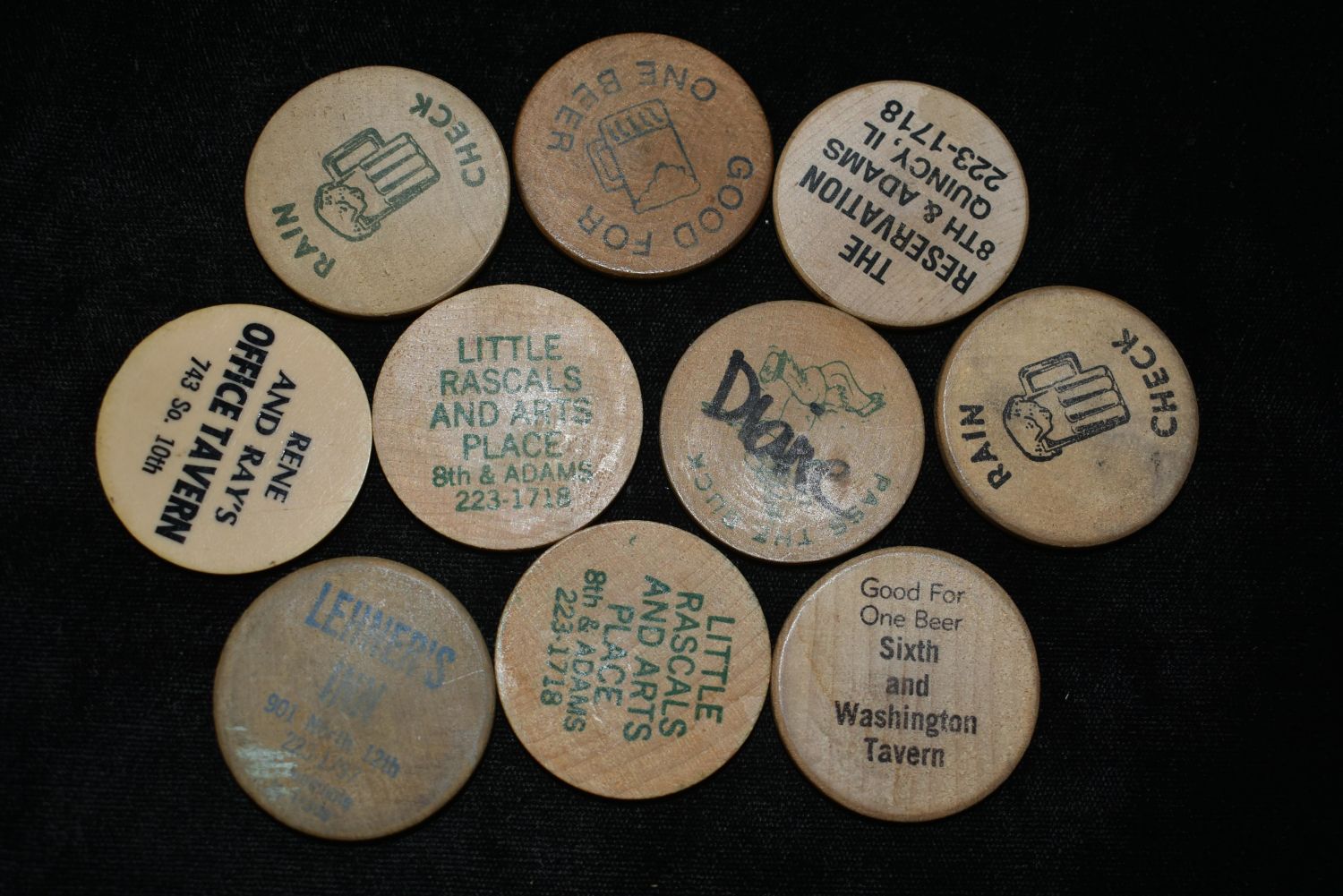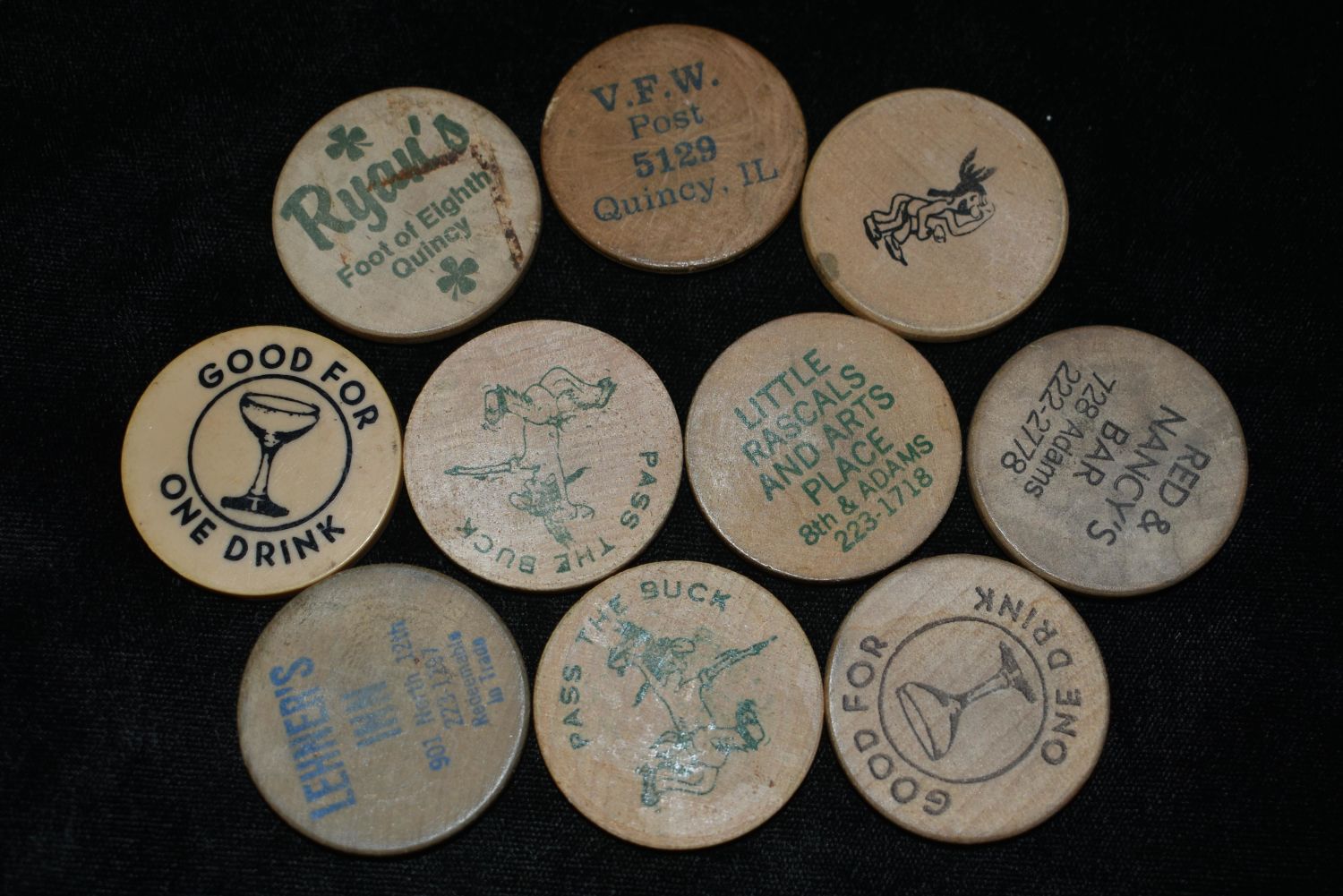 Lot of 10 Wooden Advertisiment Tokens from Quincy Illinois Condition: 100% Guaranteed Authentic via our Return Policy & Found on Private Property