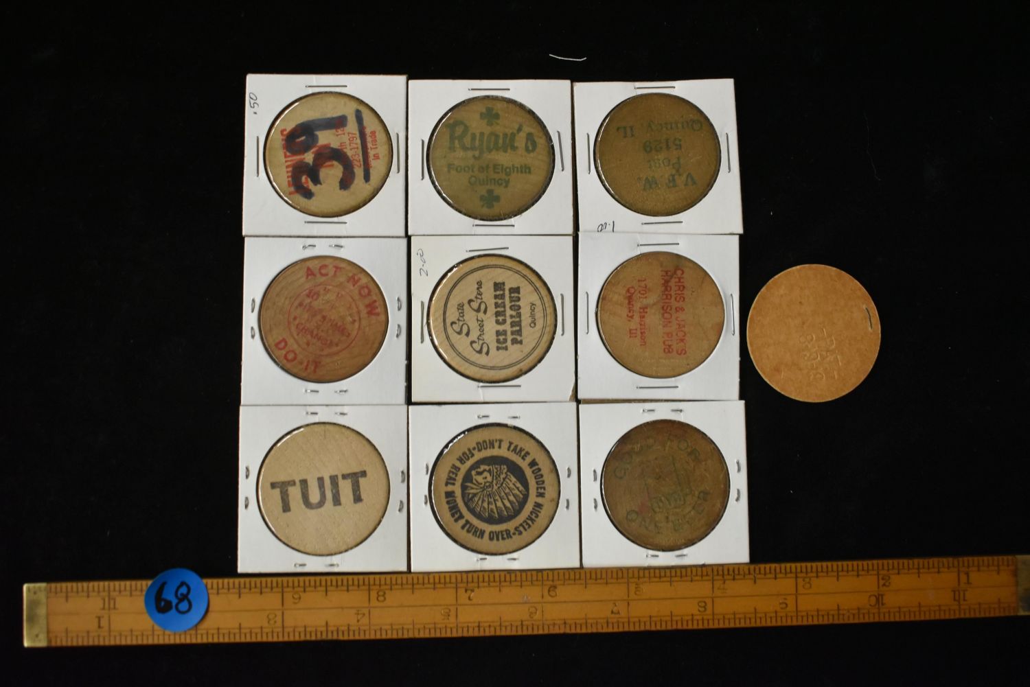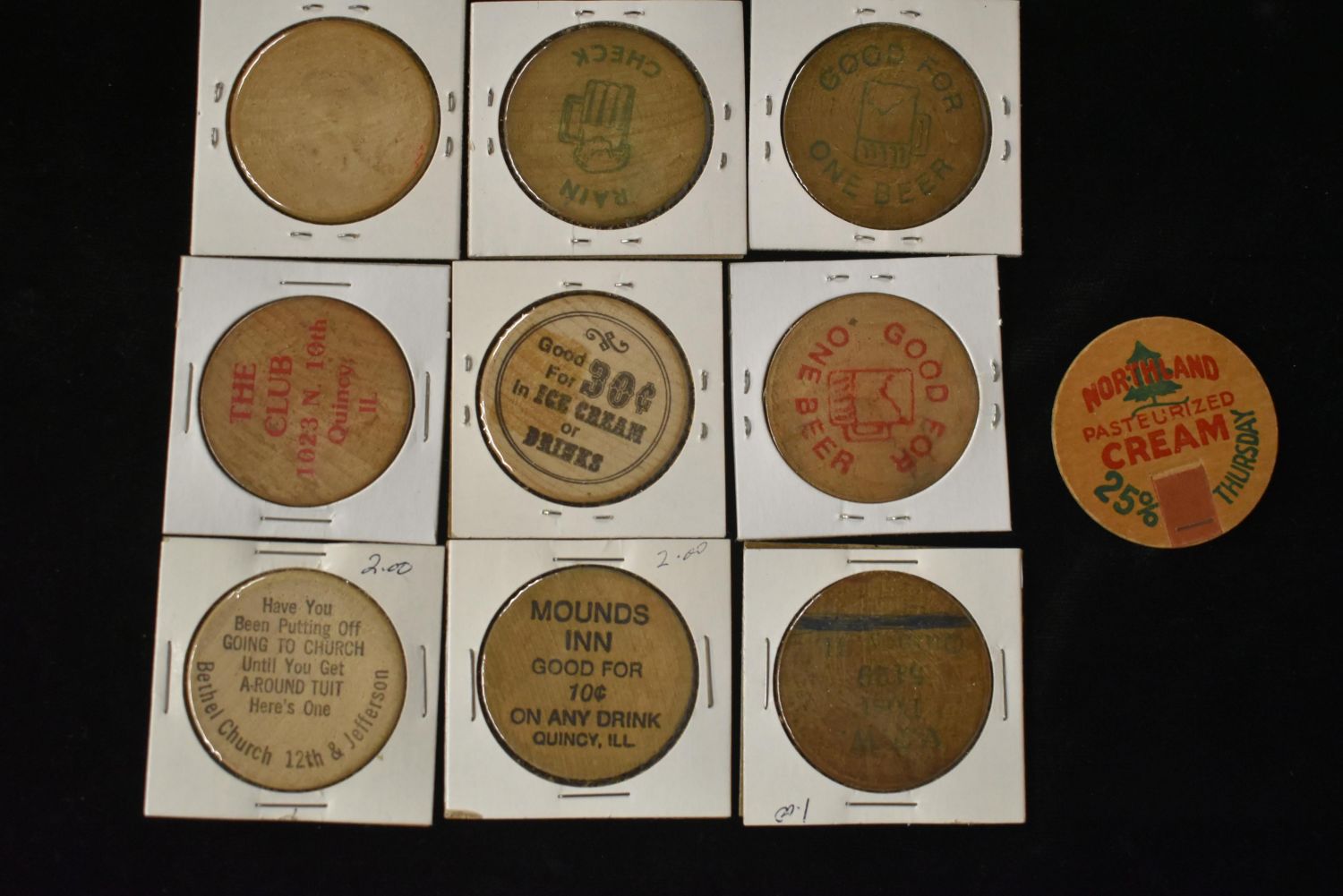 Lot of 10 Wooden Advertisement Tokens Condition: 100% Guaranteed Authentic via our Return Policy & Found on Private Property