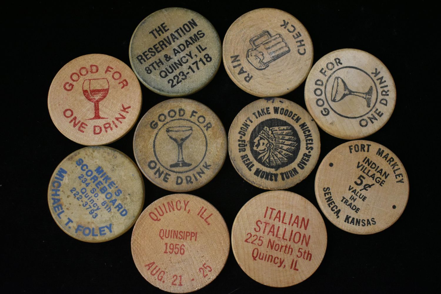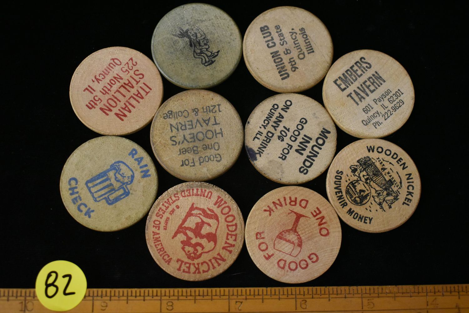 Lot of 10 Wooden Advertisement Tokens Condition: 100% Guaranteed Authentic via our Return Policy & Found on Private Property