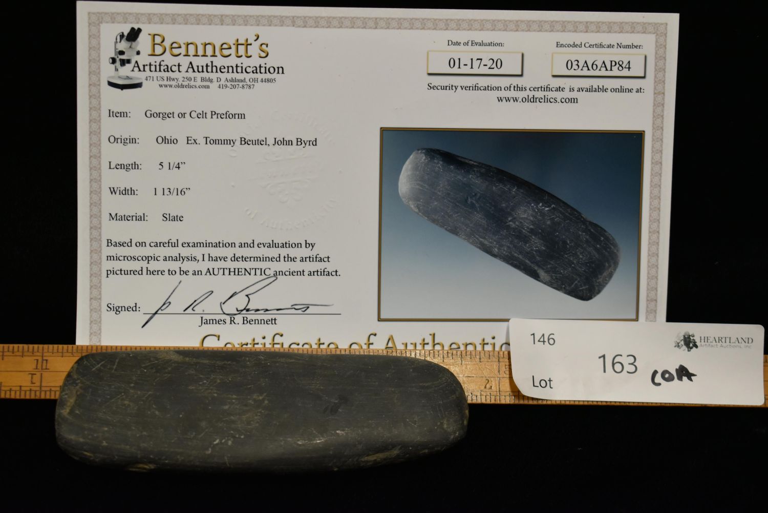 Great 5 1/4" Gorget/Celt Preform found in Ohio Ex. Tommy Beutel, John Byrd Bennett C.O.A