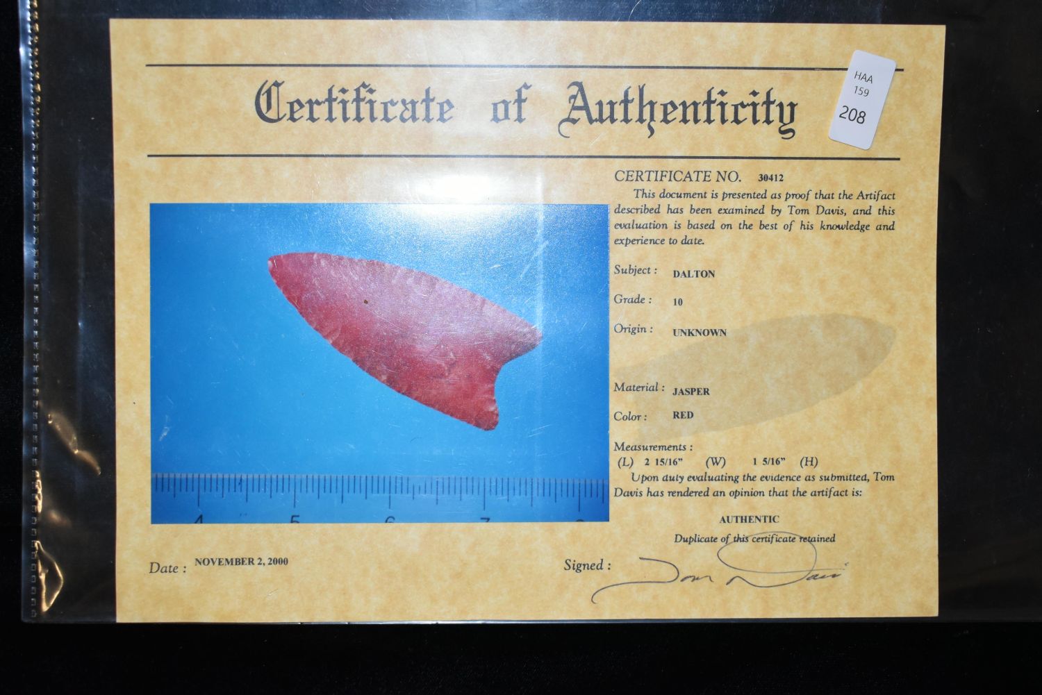 2 15/16" Jasper Dalton, Davis C.O.A ( Heartland Artifact Auctions believes the point to be a Reproduction) Native American Artifact