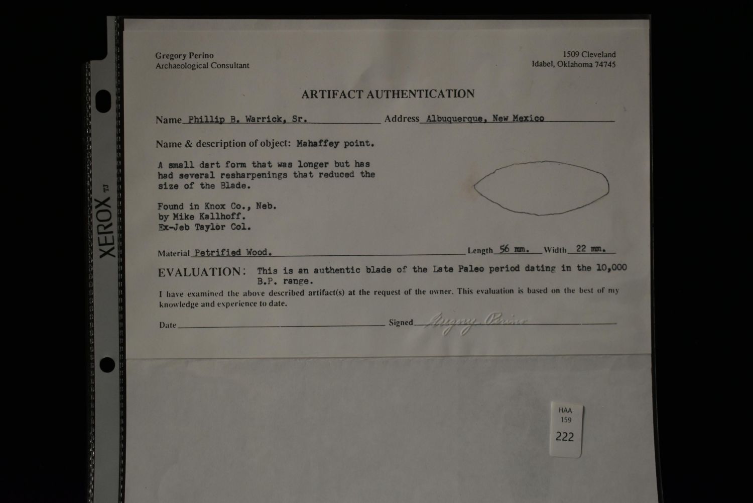 2.2" Mahaffey found in Knox Co., Nebraska Perino C.O.A Authentic Native American Artifact