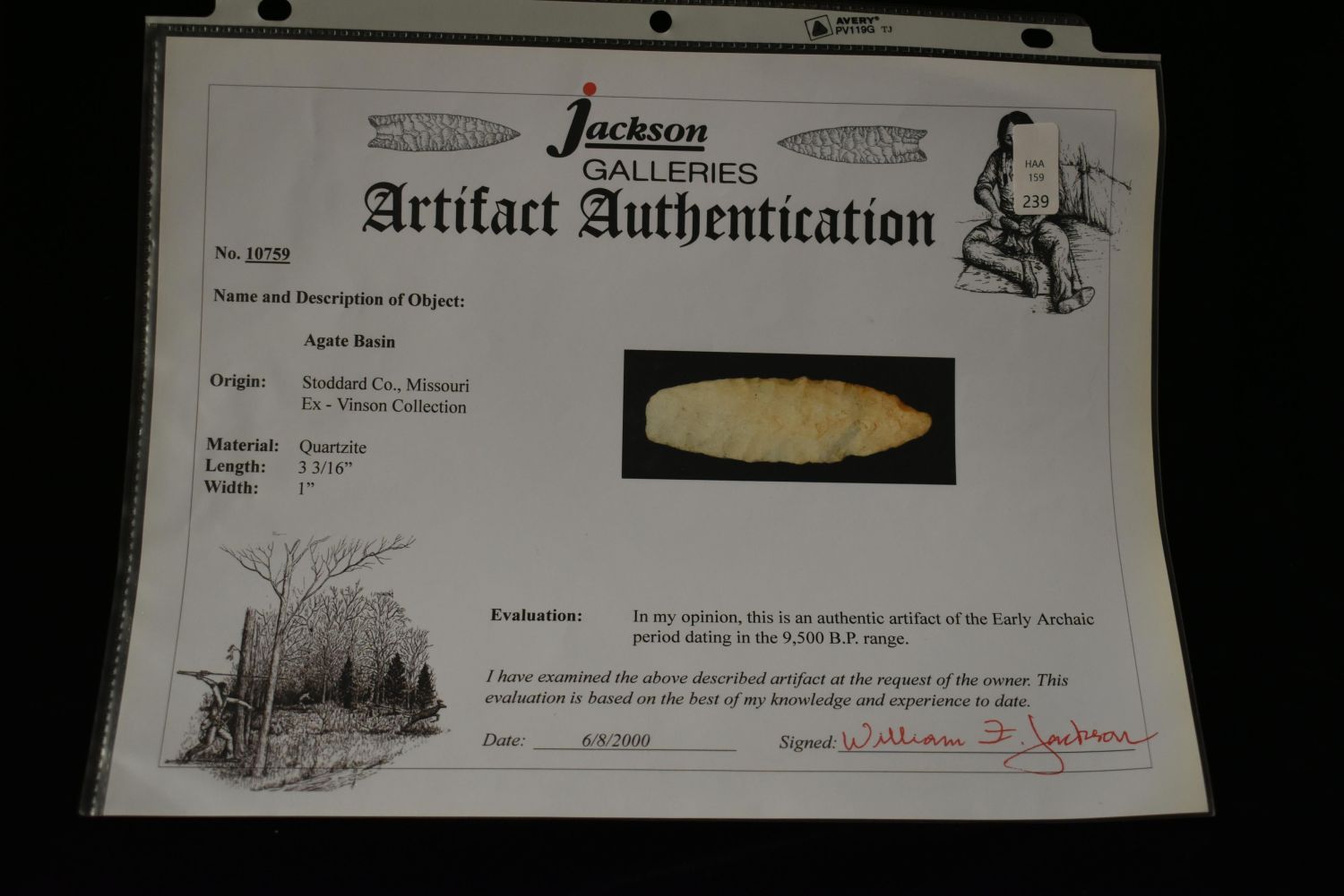 3 3/16" Agate Basin, Stoddard Co., Missouri, Jackson C.O.A Authentic Native American Artifact