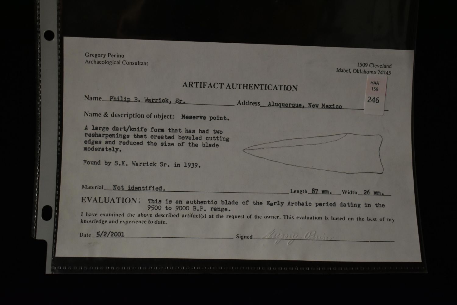 3.43" Meserve, FB S.K. Warrick Sr. in 1939, Perino C.O.A Authentic Native American Artifact