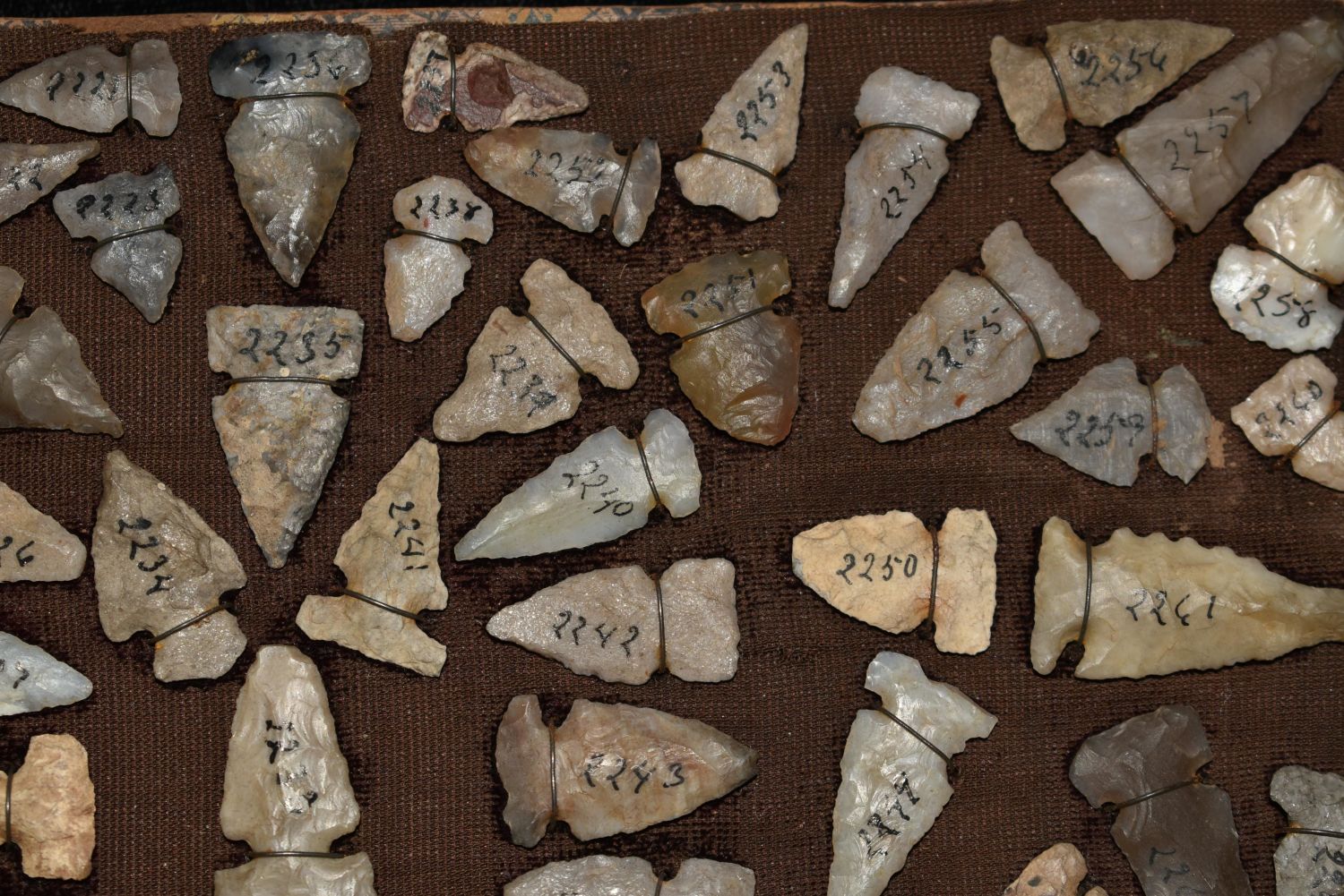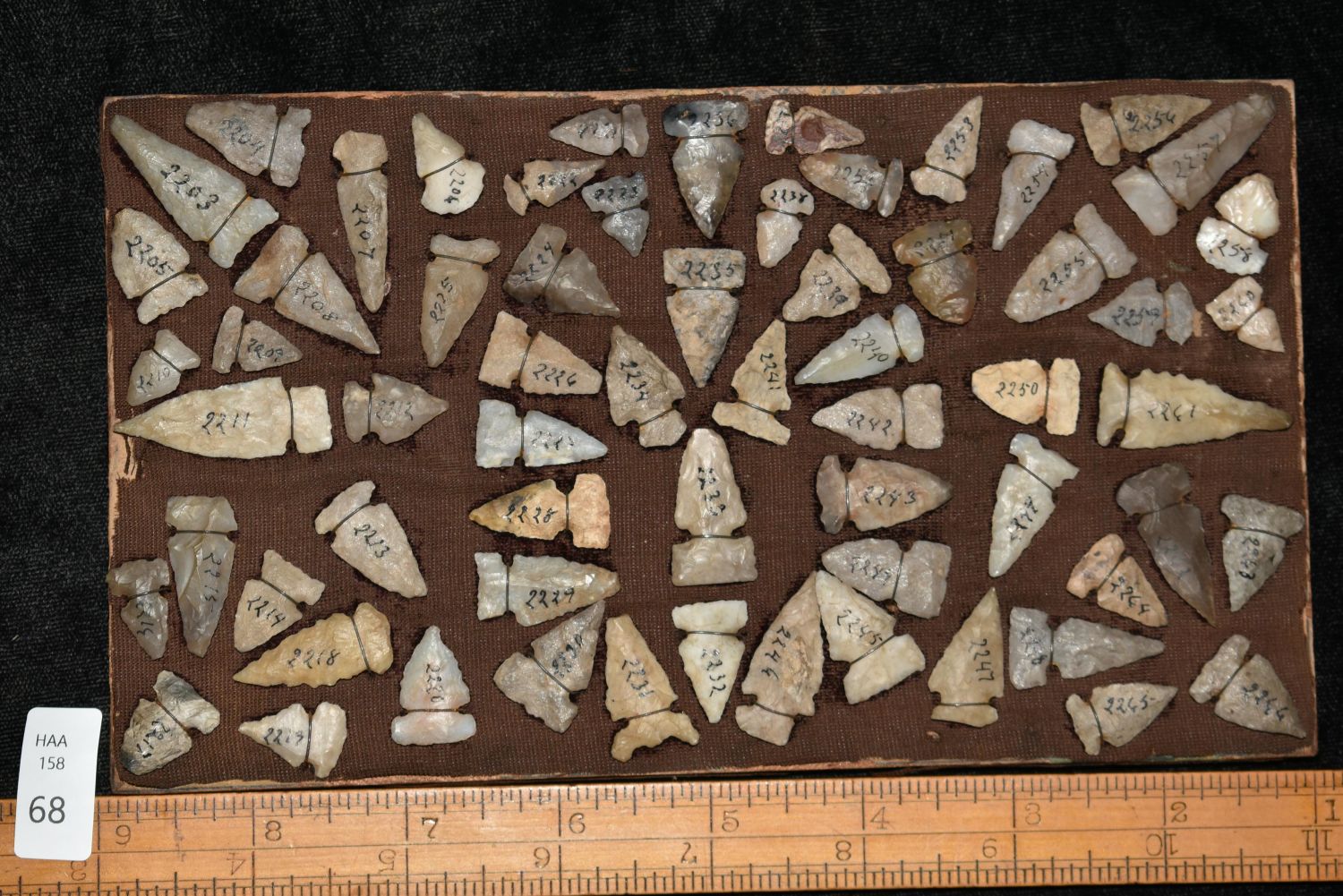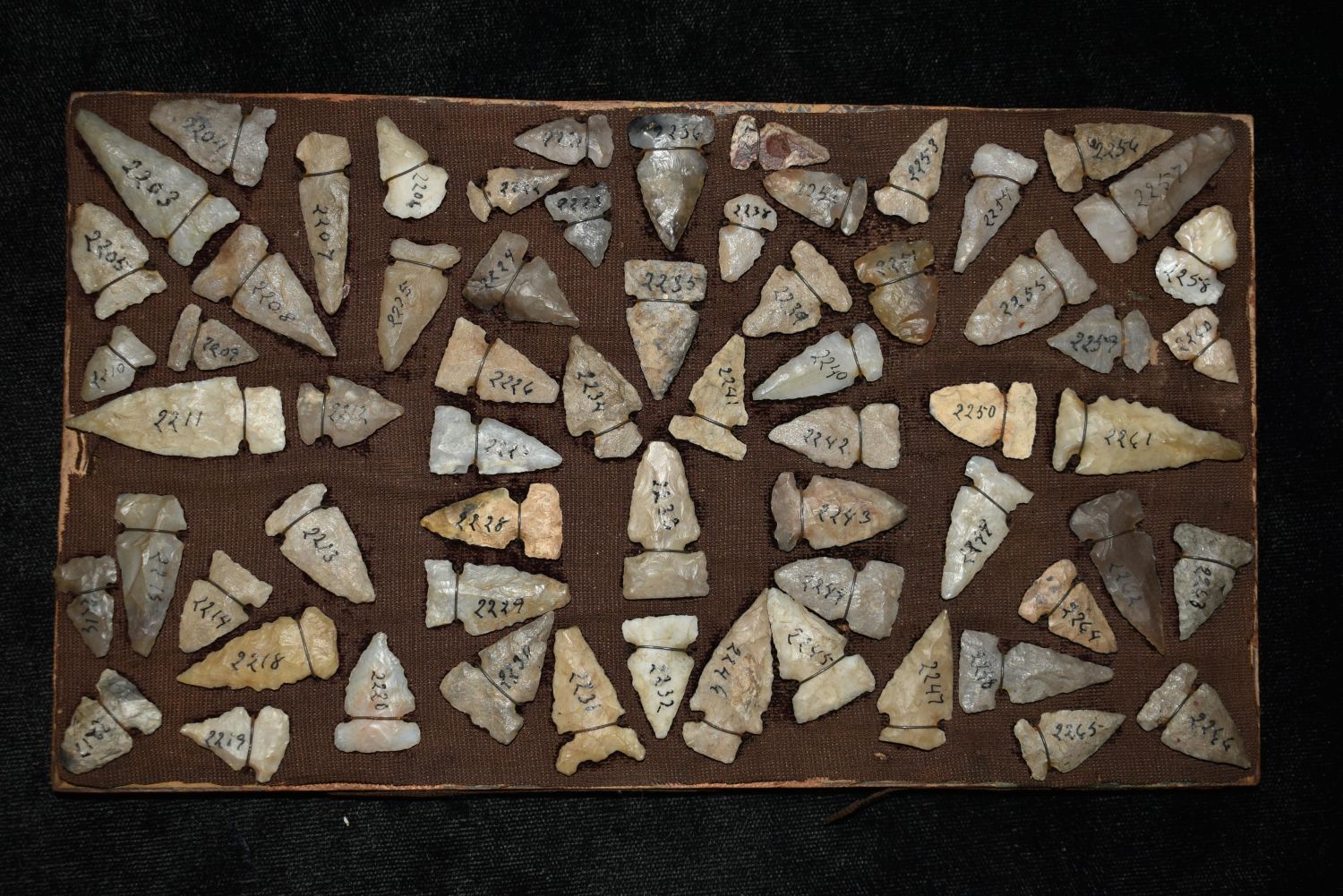 Approximately 61 Birdpoints found in New Mexico, All Wire Wrapped on a Antique 8 x 4 1/2" Board Authentic Native American Artifact