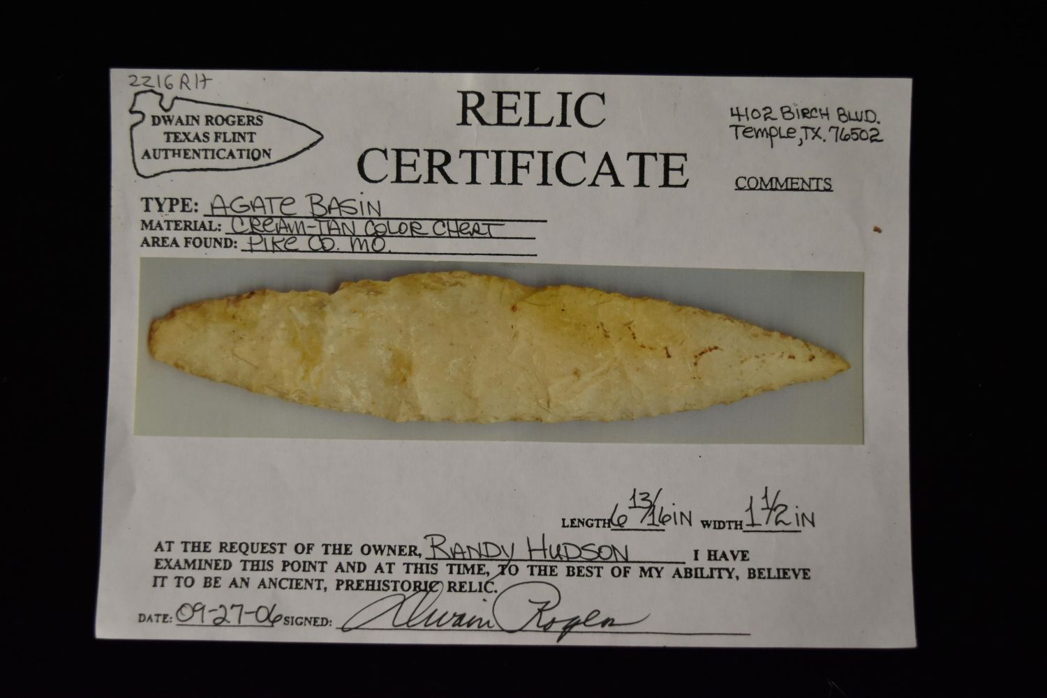 6 13/16" Agate Basin Blade, Rogers COA, Pike Co, Missouri, Ex Randy Hudson Condition: 100% Guaranteed Authentic via our Return Policy & Found on Private Property