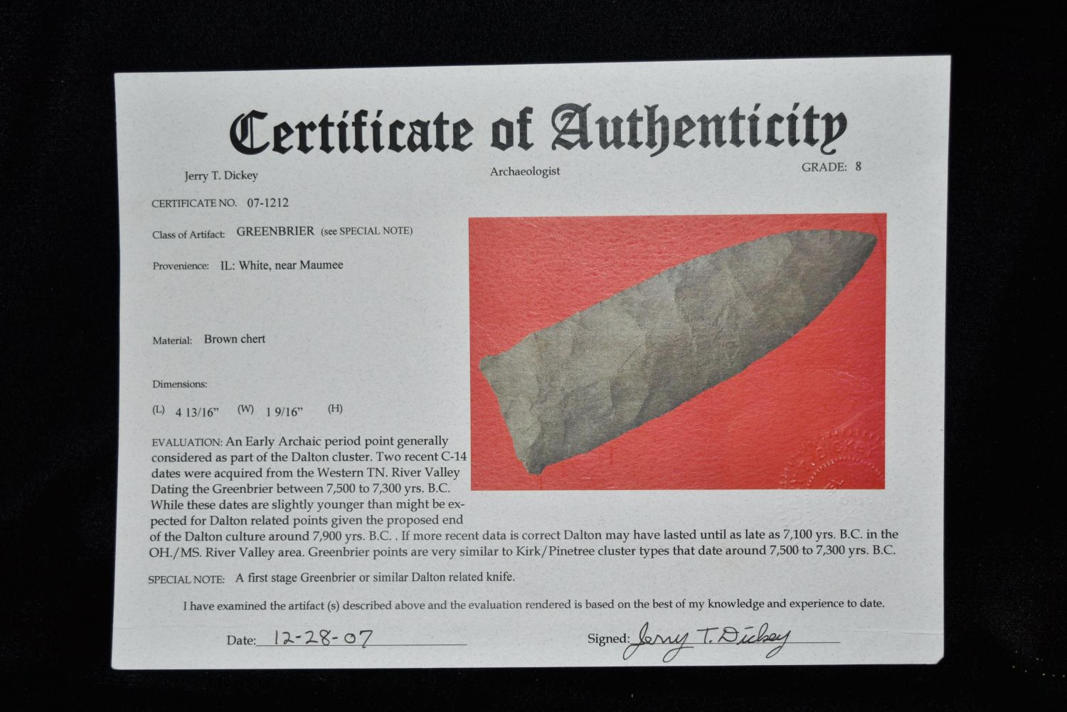4 13/16" Greenbrier Point, Dickey COA, White Co, Illinois Condition: 100% Guaranteed Authentic via our Return Policy & Found on Private Property
