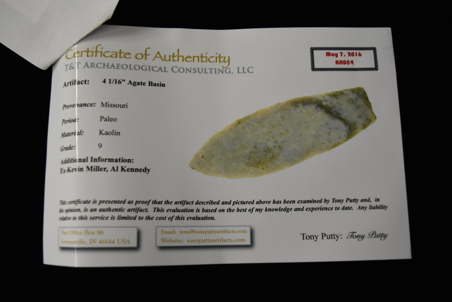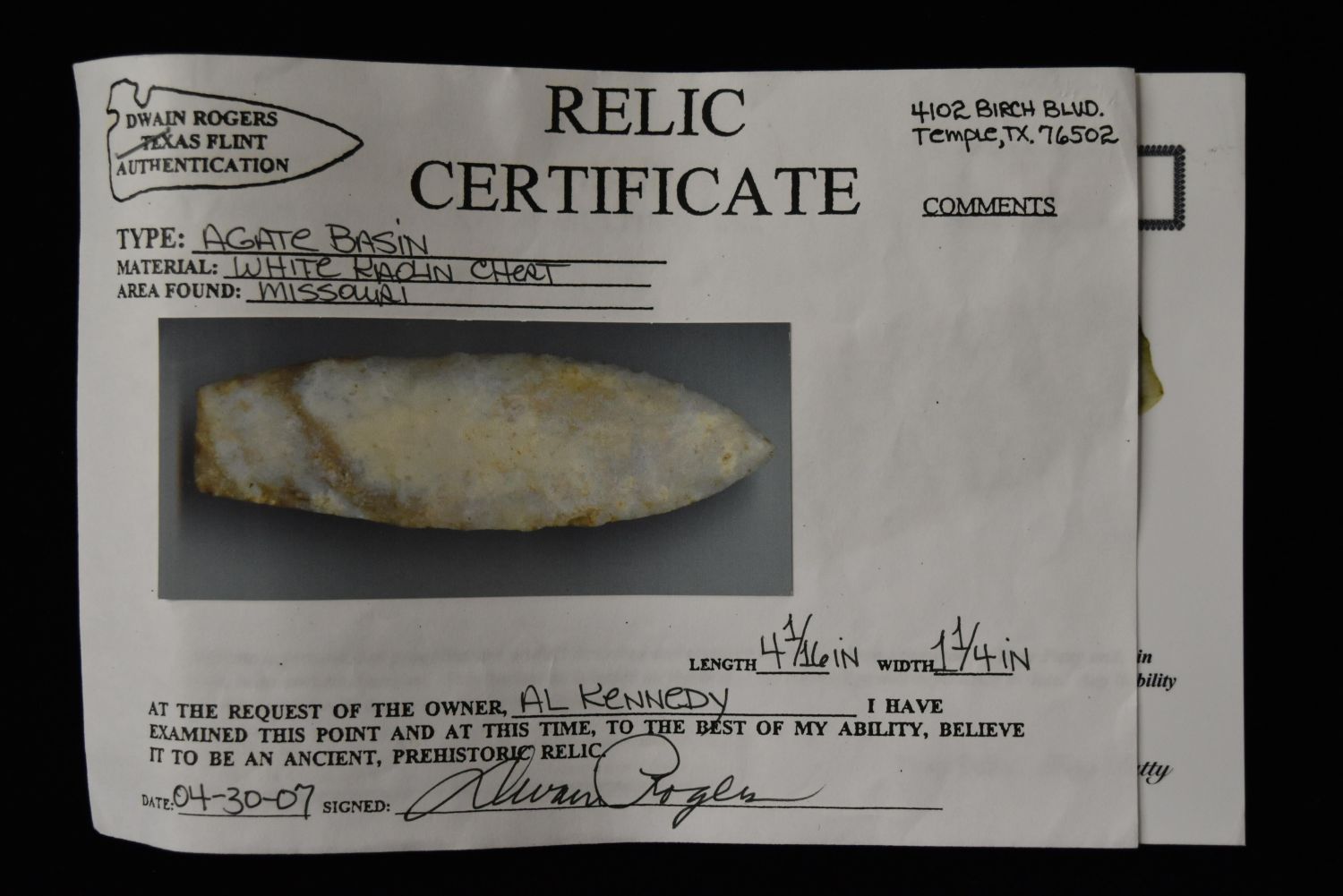 4 1/16" Kaolin Agate Basin Point, Rogers COA, Putty COA, Missouri Condition: 100% Guaranteed Authentic via our Return Policy & Found on Private Property